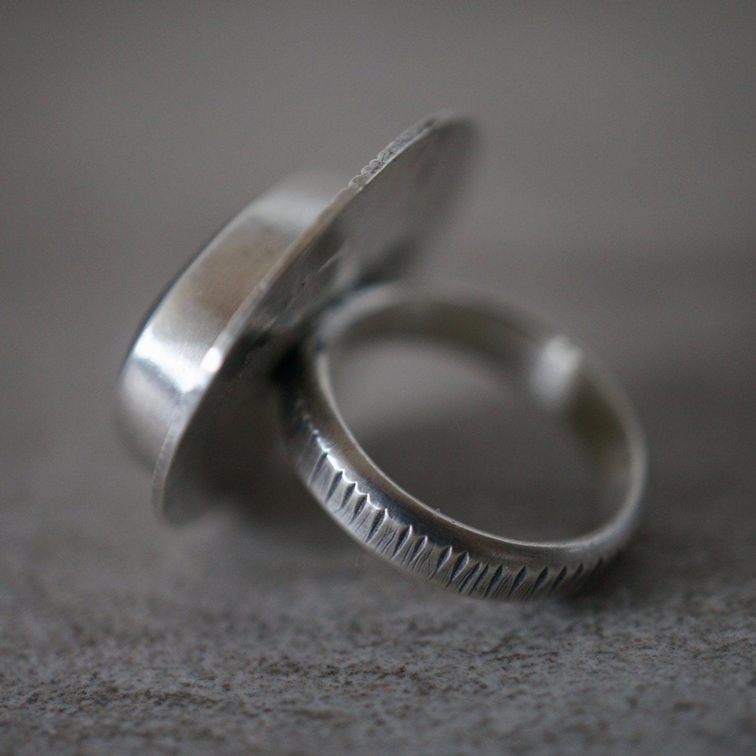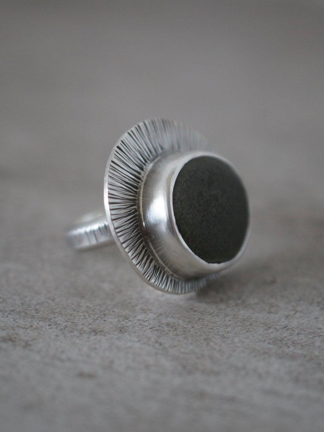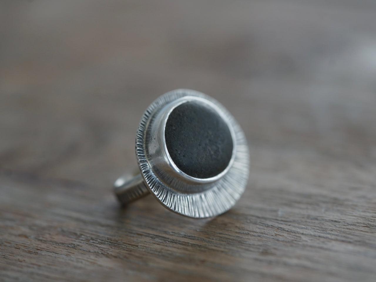 This is a very interesting, asymmetrical statement ring, US size 5.25, featuring a grey, smooth beach pebble framed by a setting with a ray-like texture. The reduced colour scheme of the design gives this ring an understated elegance and a very contemporary feel. A modern shield ring, reduced to the essentials.