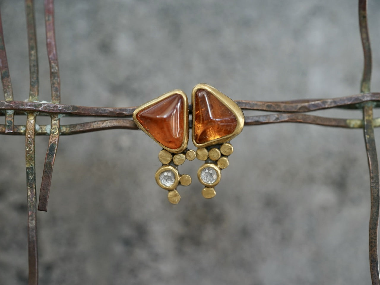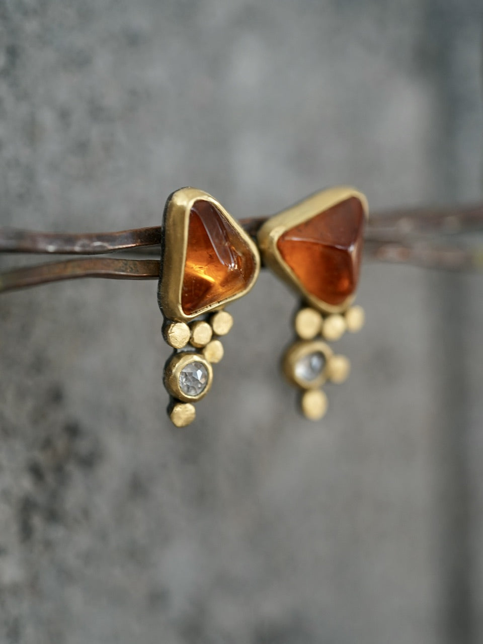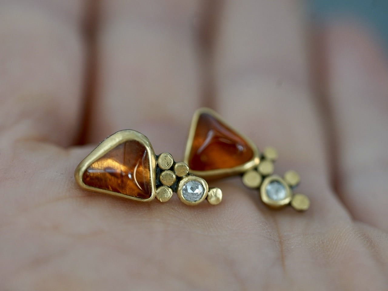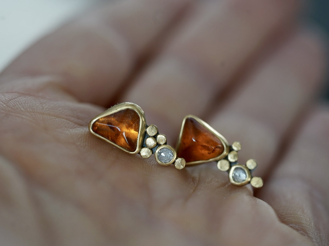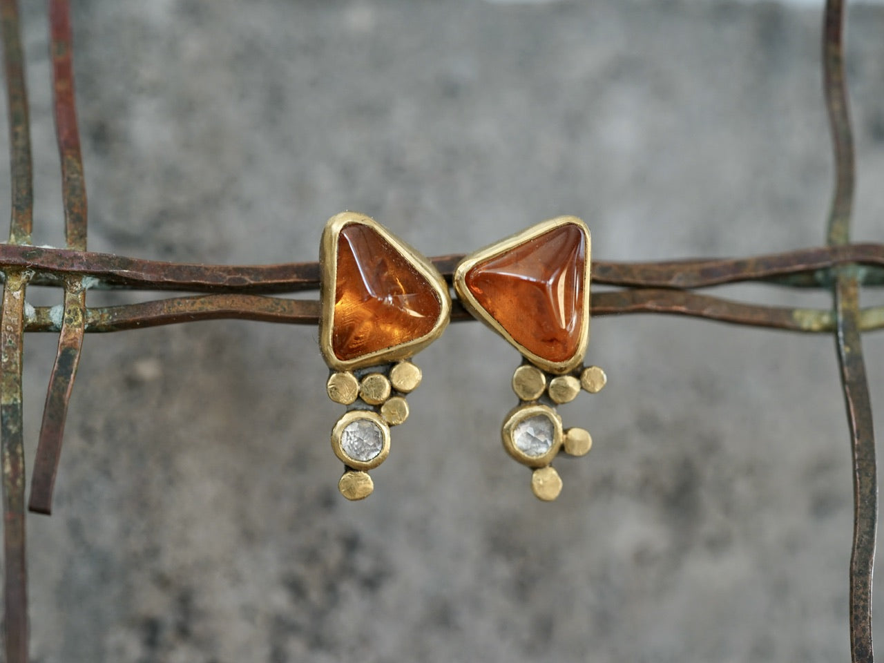 A set of asymmetrically shaped hessonite garnets with an organic, smooth cut were set in 22k gold, embellished with little gold discs and combined with sparkly rose cut white diamonds.