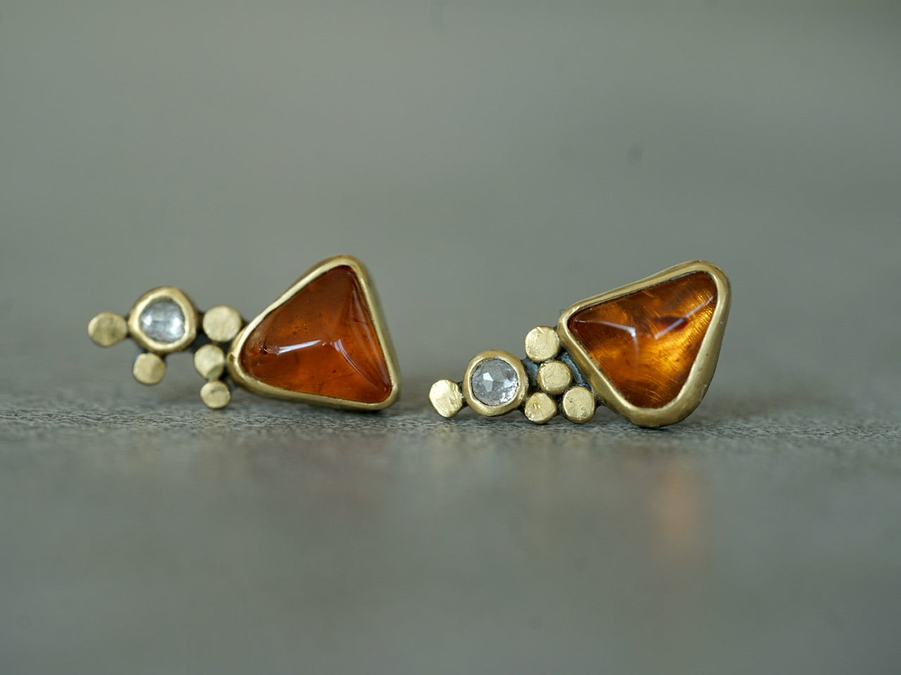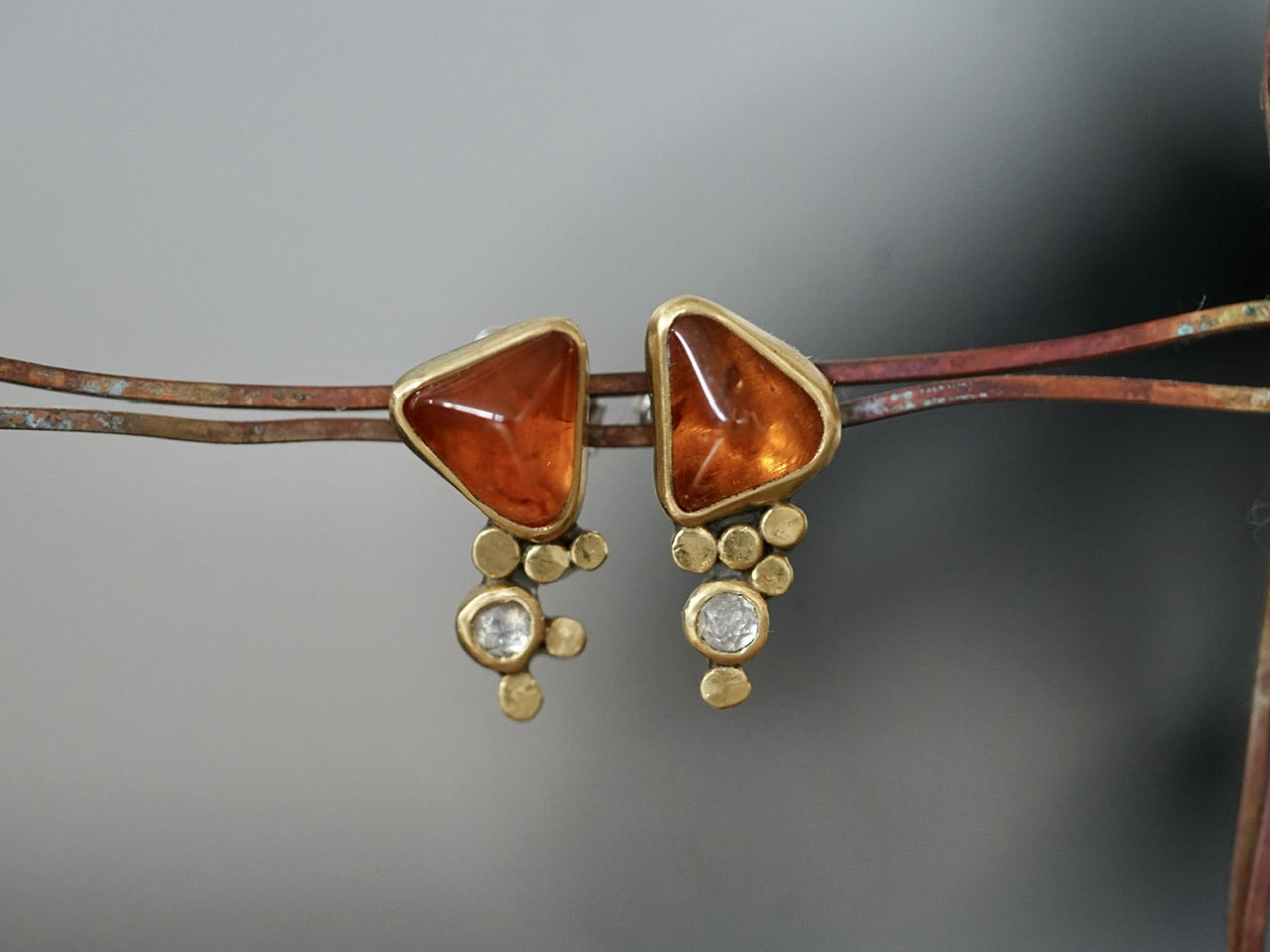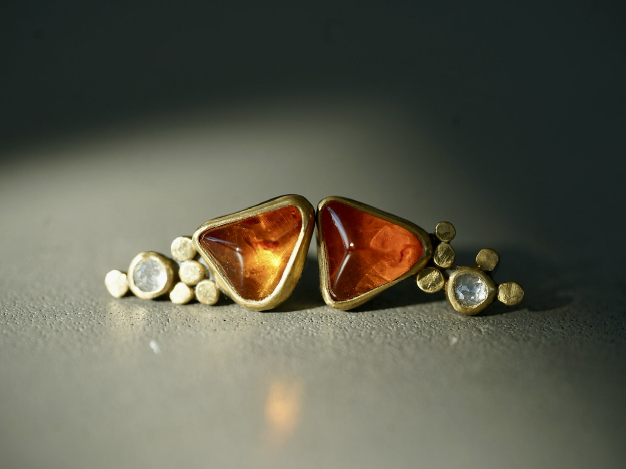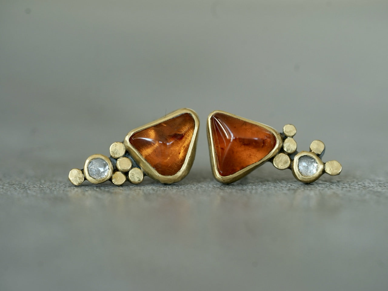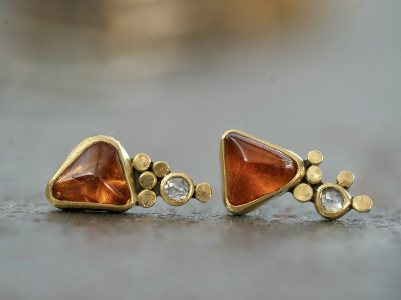 A set of asymmetrically shaped hessonite garnets with an organic, smooth cut were set in 22k gold, embellished with little gold discs and combined with sparkly rose cut white diamonds.