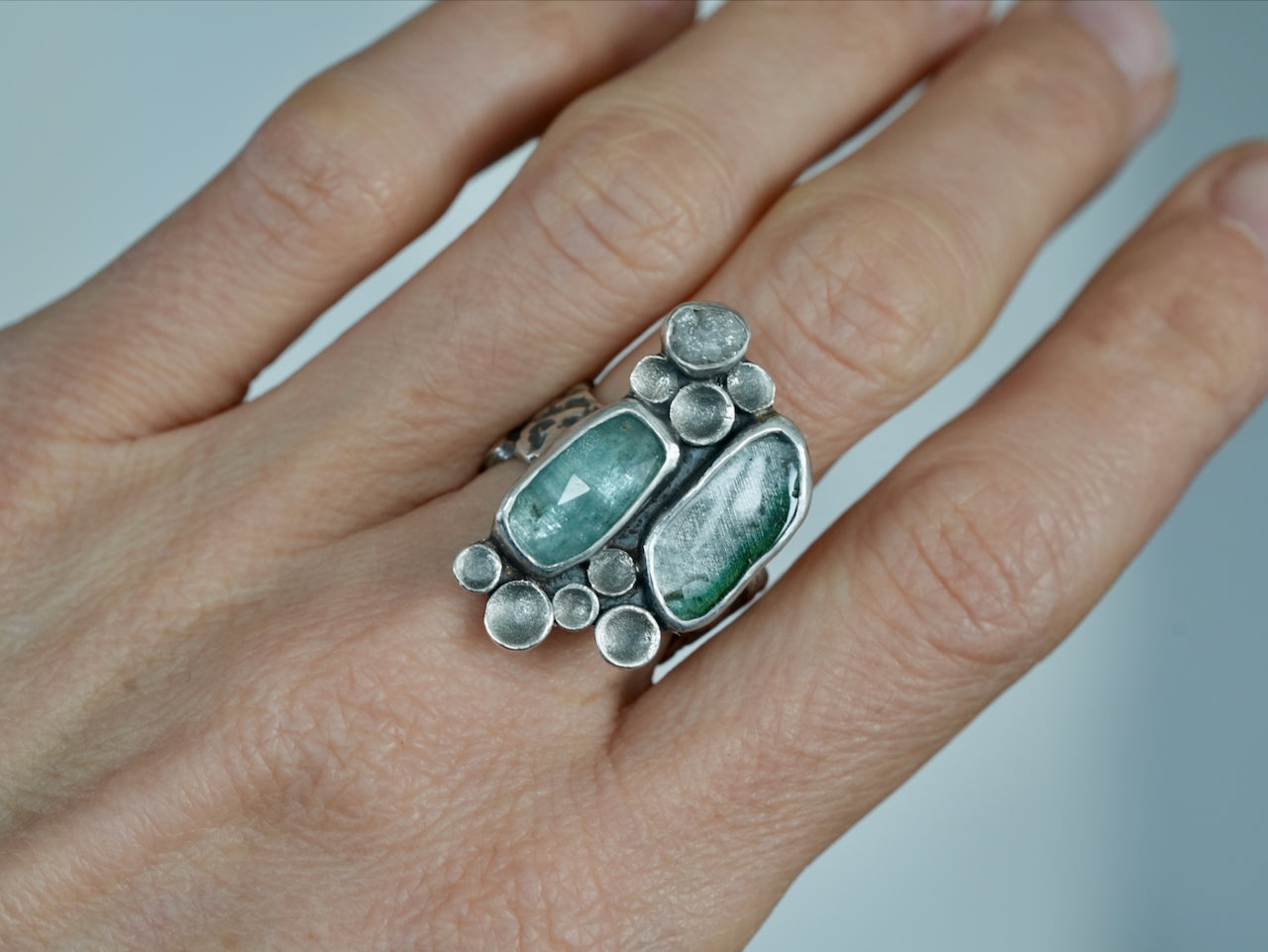 Kyanite and Tourmaline Cluster Ring – Handmade in Sterling Silver, size 7.75-8