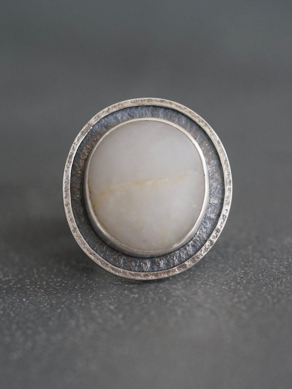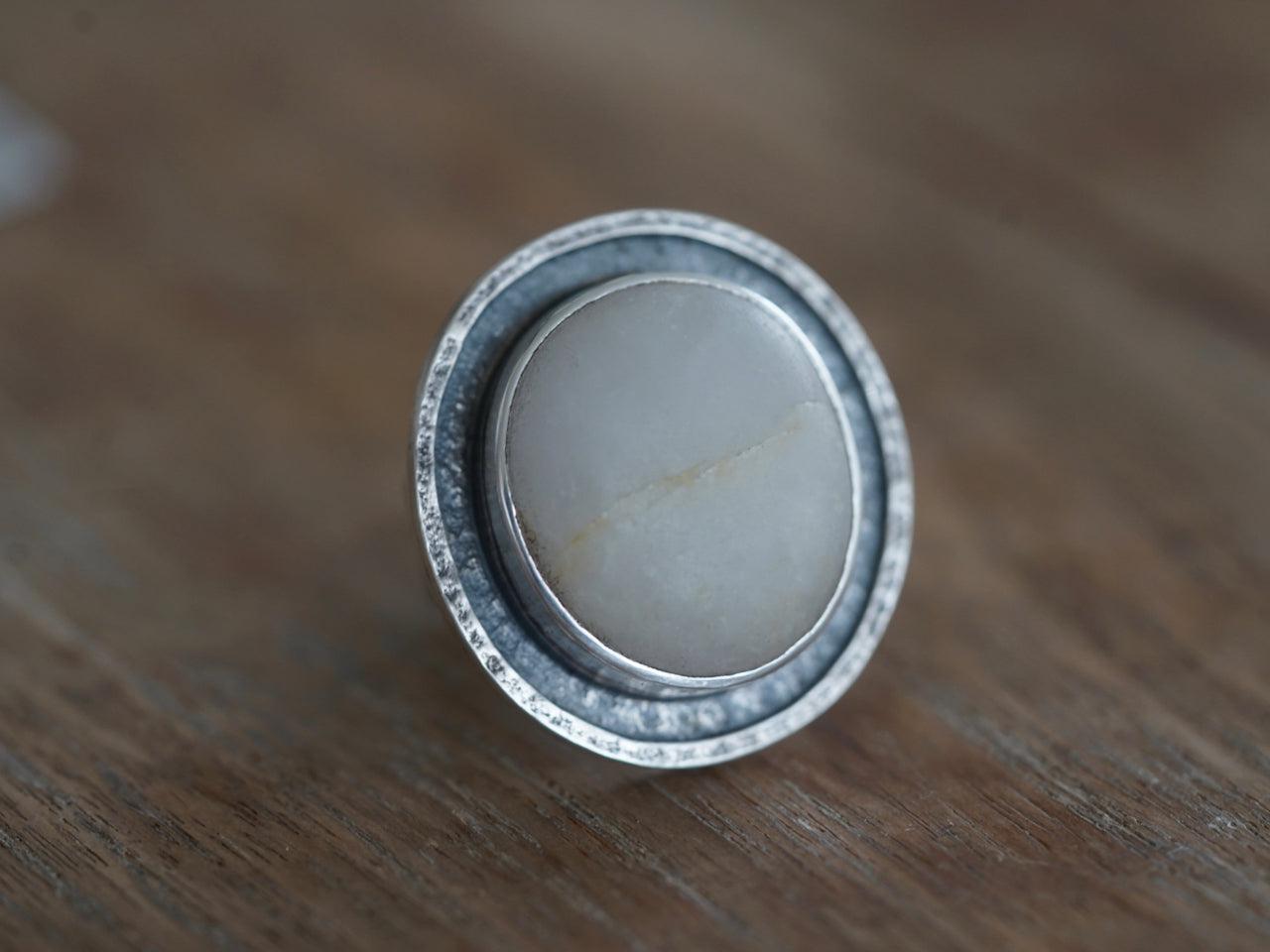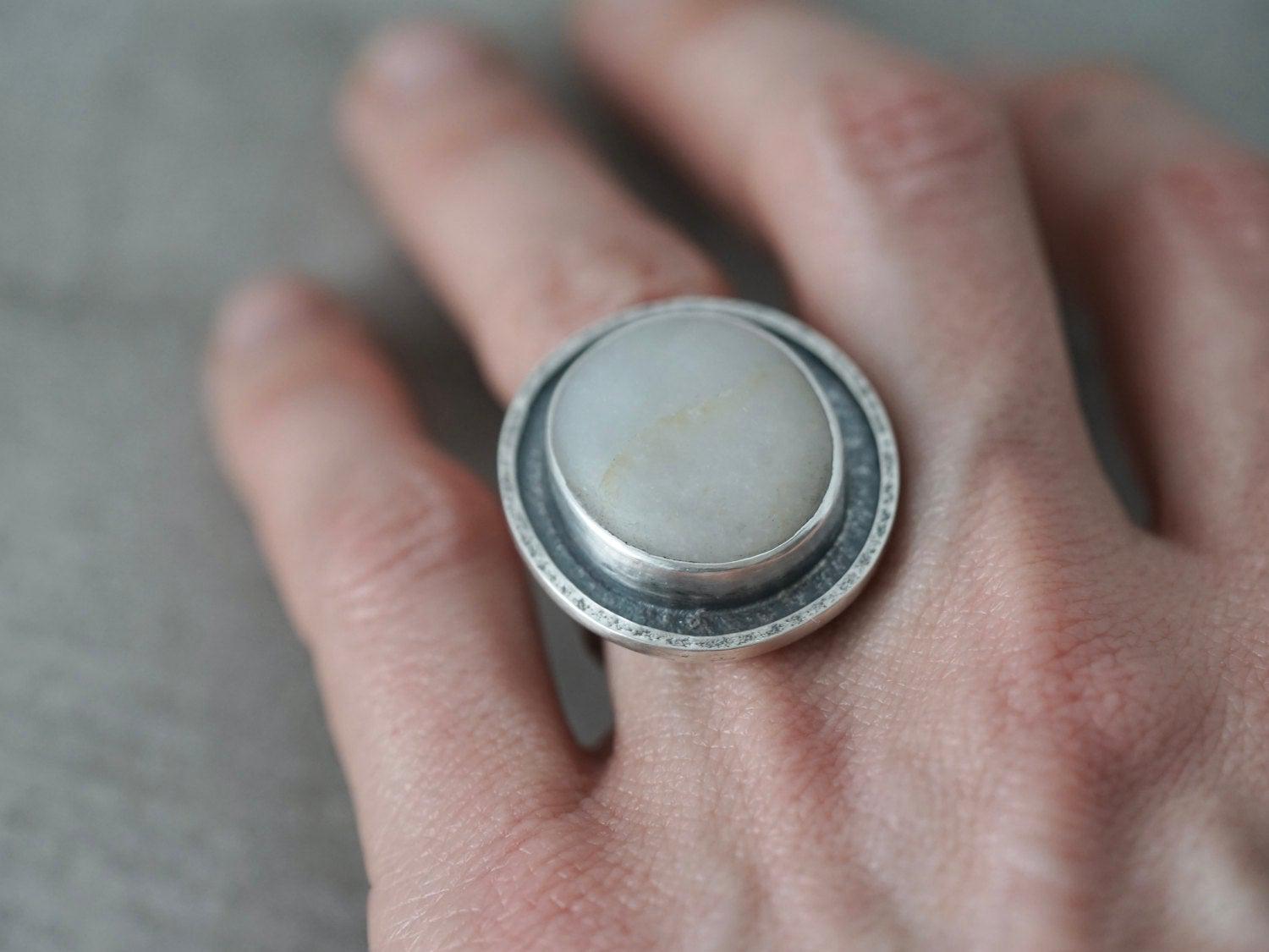 A white beach pebble, polished by sand and water is the focal element of this modern sterling silver statement ring in US size 6.5. Clean and simple lines reflect the beauty of the natural stone. The textured sterling silver backplate and wire frame add contrast and give this ring an organic, contemporary feel. The substantial sterling silver band is lightly textured to complete the look