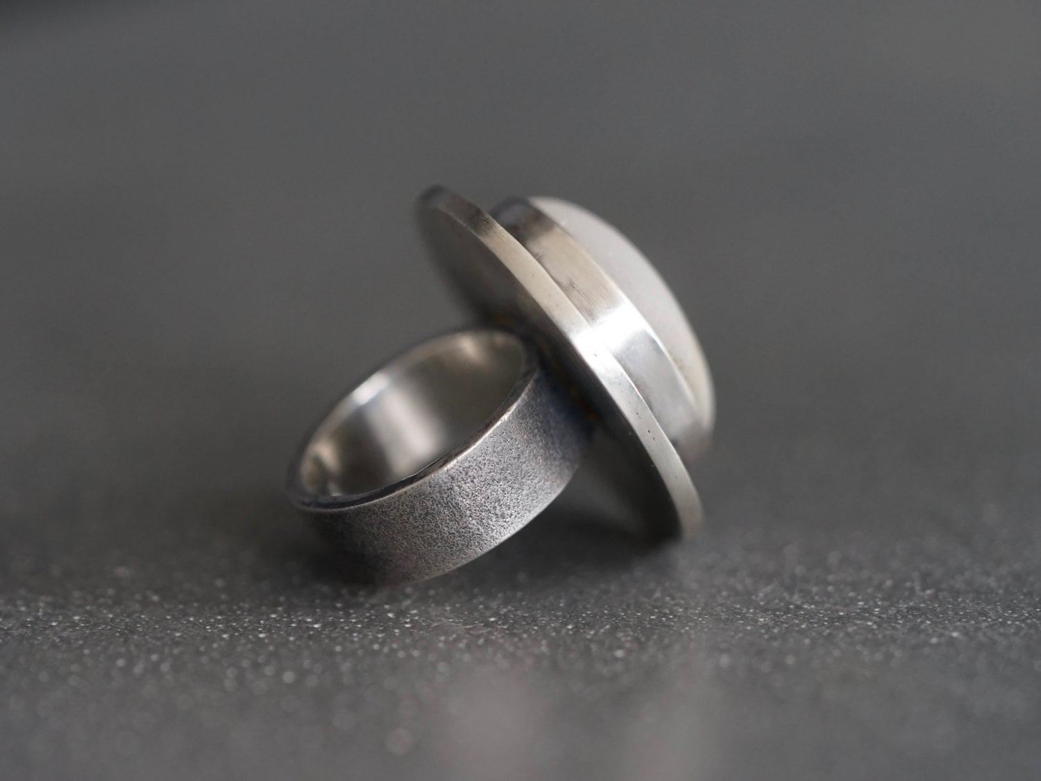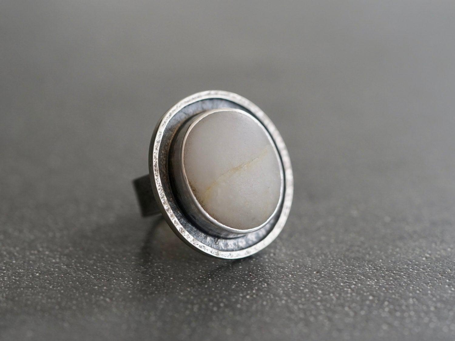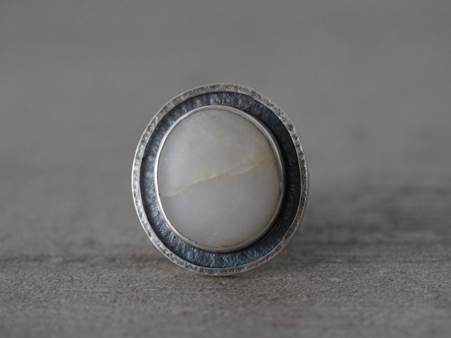 A white beach pebble, polished by sand and water is the focal element of this modern sterling silver statement ring in US size 6.5. Clean and simple lines reflect the beauty of the natural stone. The textured sterling silver backplate and wire frame add contrast and give this ring an organic, contemporary feel. The substantial sterling silver band is lightly textured to complete the look