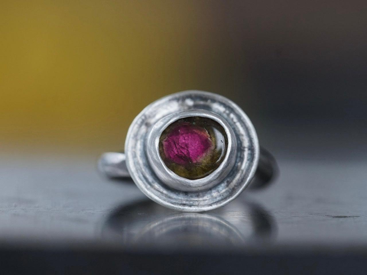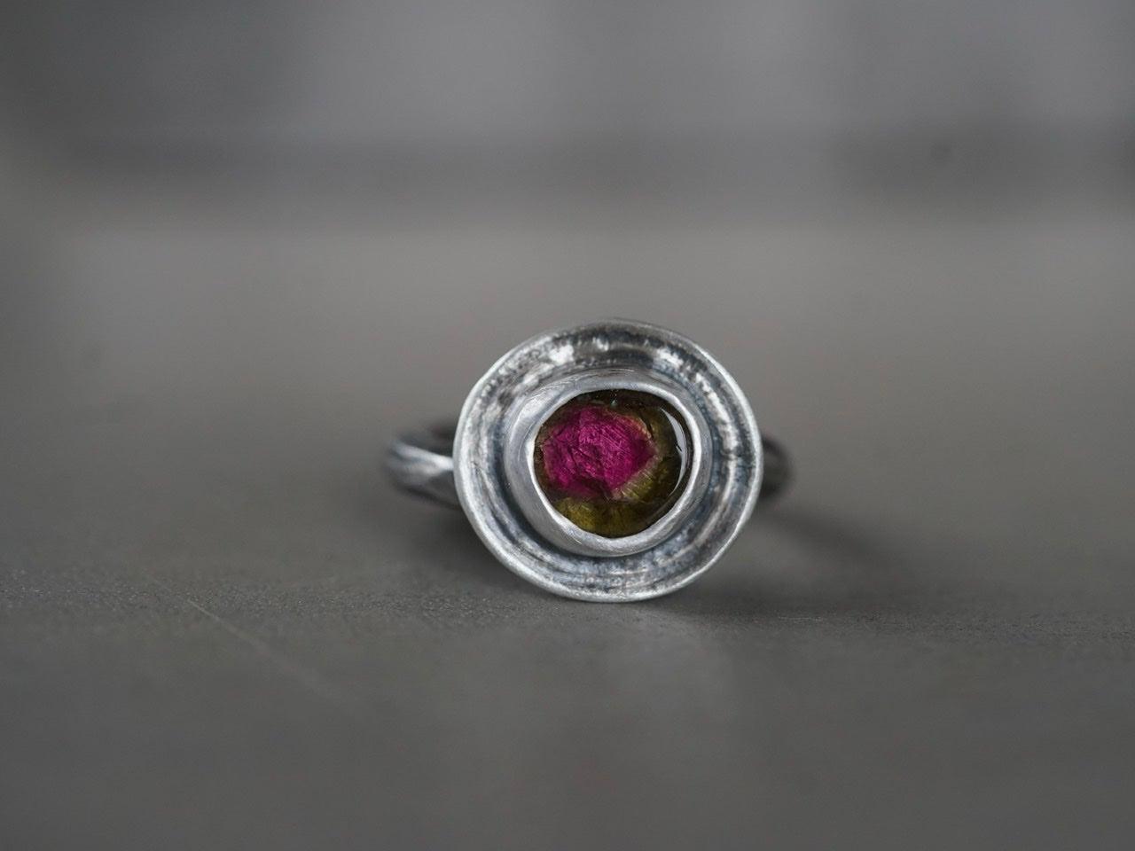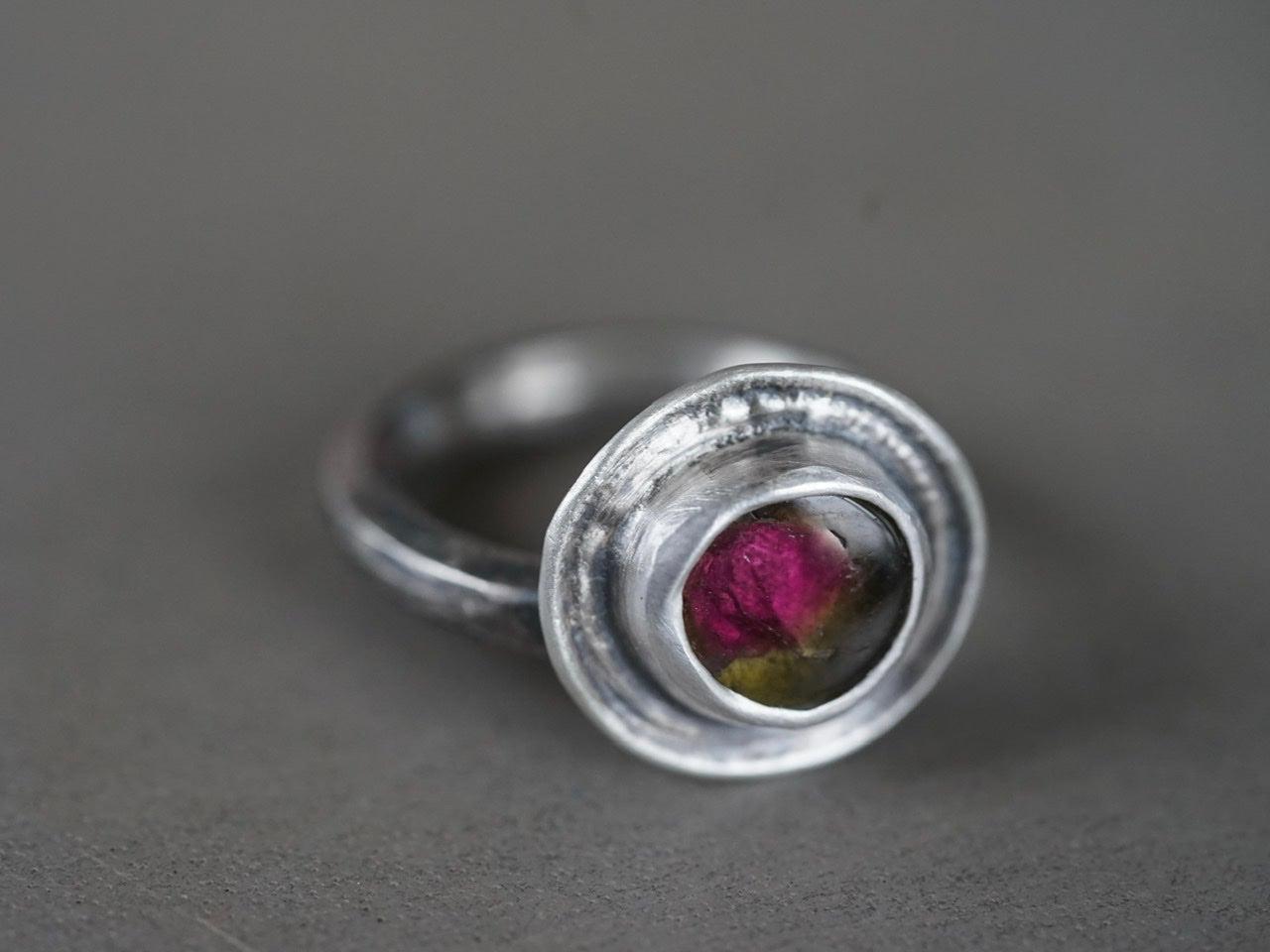 Stone: 10 x9 mm, tourmaline freeform nugget, set in fine silver