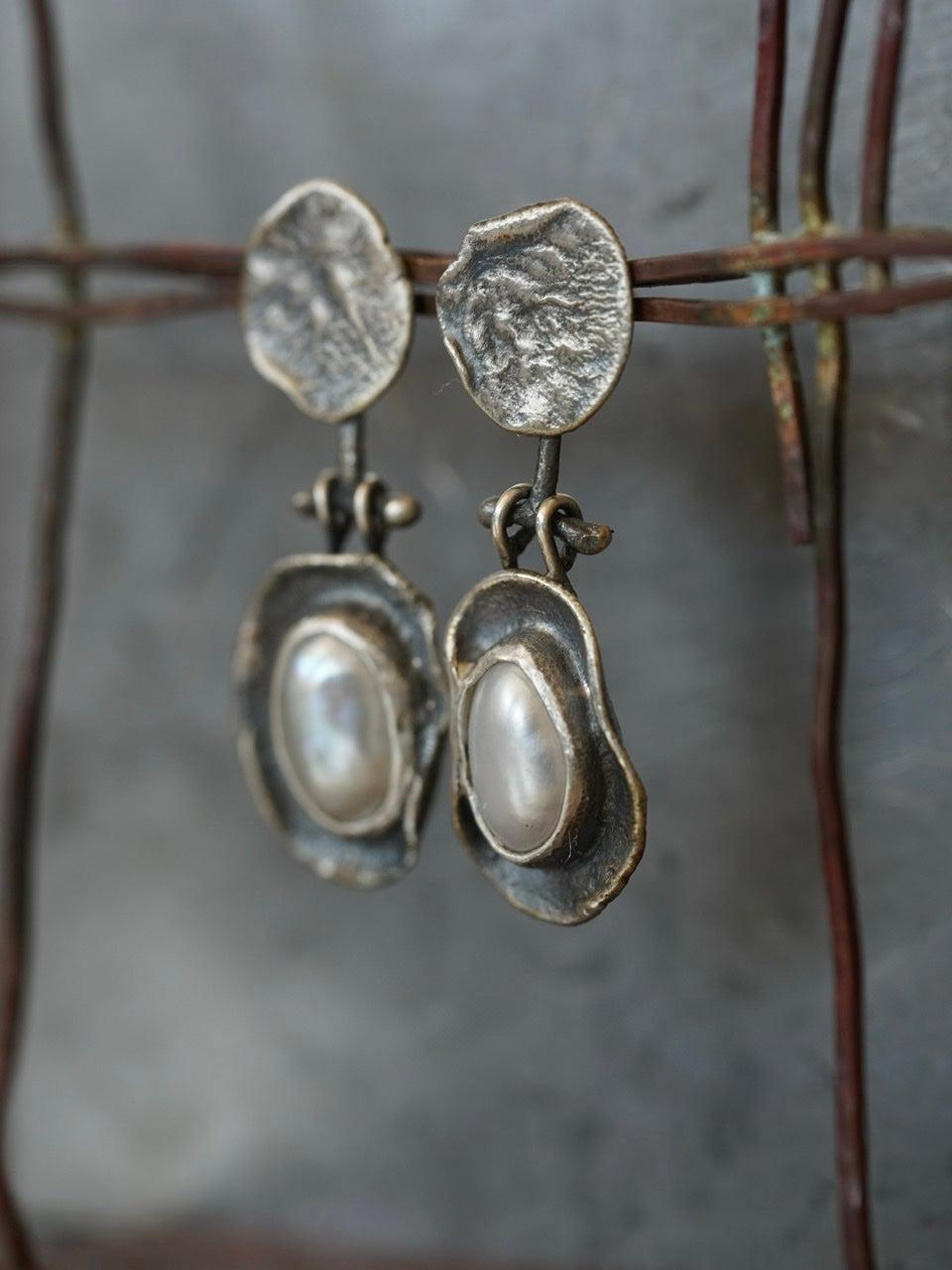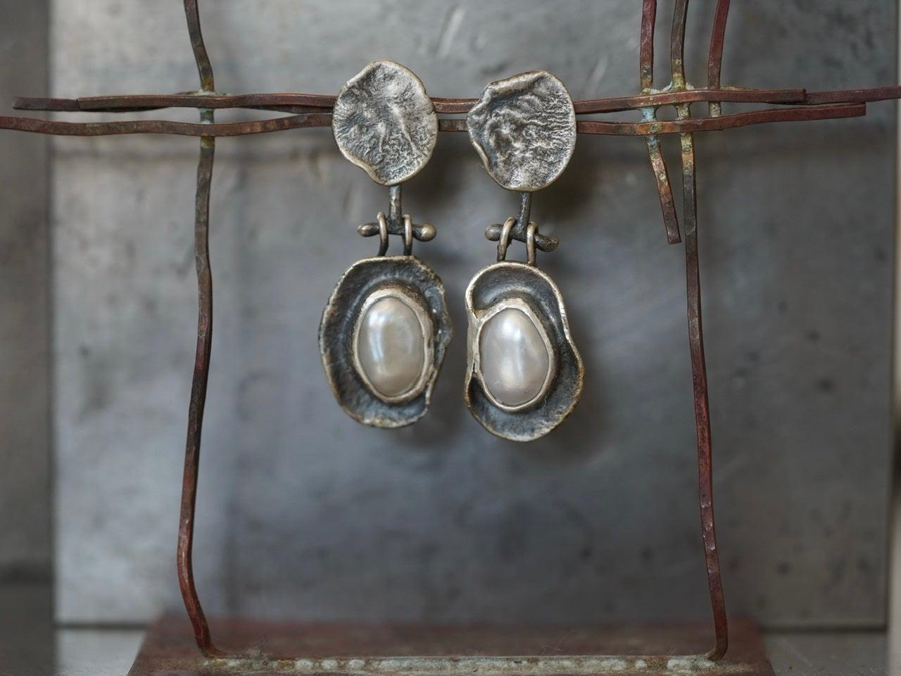 Melted silver earrings, embellished with stones, linked with creativity, waiting to be enjoyed.