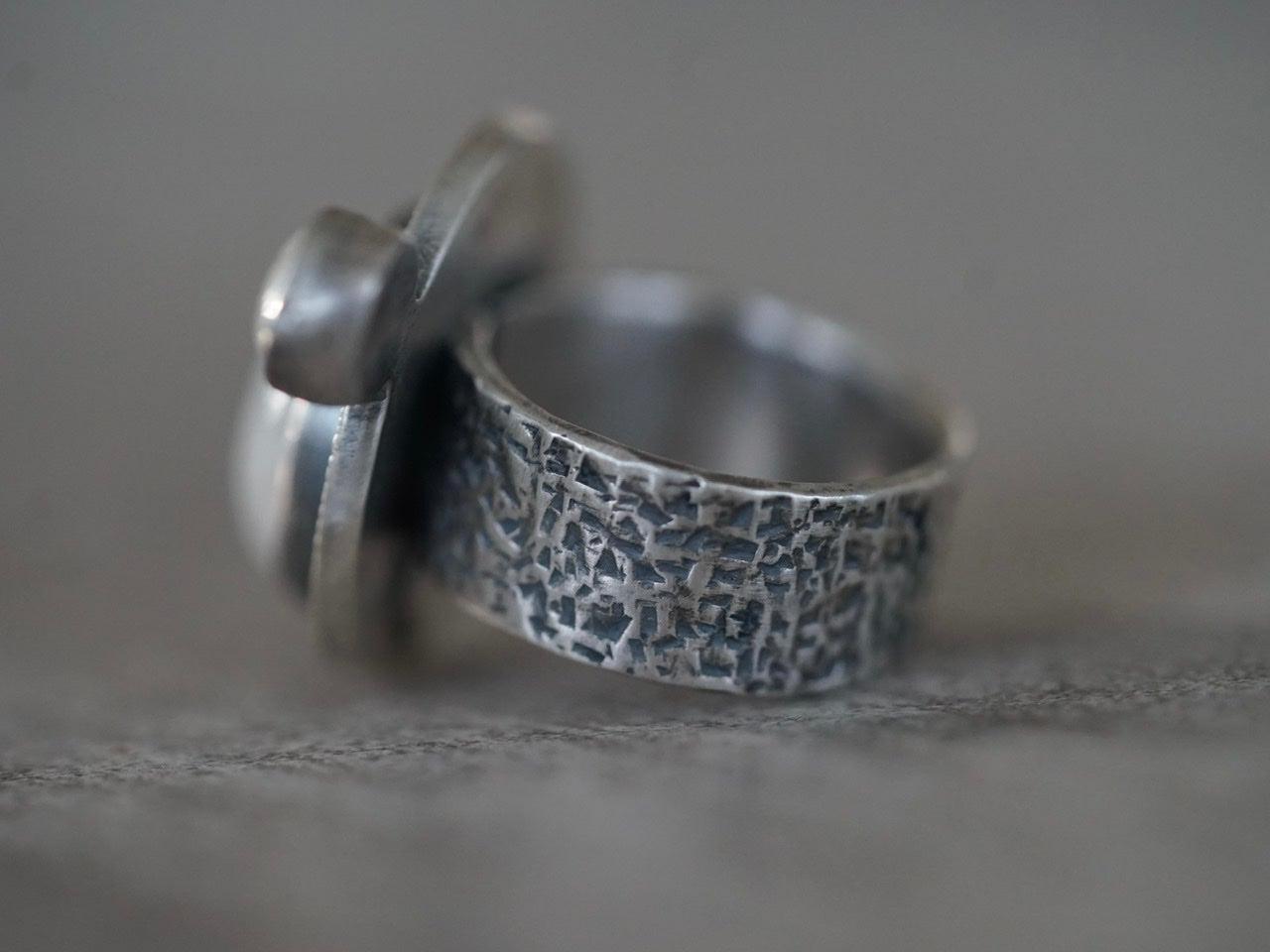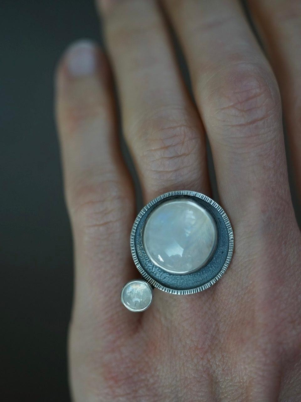 Satellite ring: two juxtaposed moonstones, orbiting each other, separated by negative dark space, their path delineated by a silvery line. This is a statement ring with a tranquil yet powerful feel. The clear lines of the geometric design is complemented by the organically textured surfaces, the blue shimmer of the moonstones adds a beautiful colour accent. As most of my pieces, this ring is one of a kind and marked with my maker´s stamp.