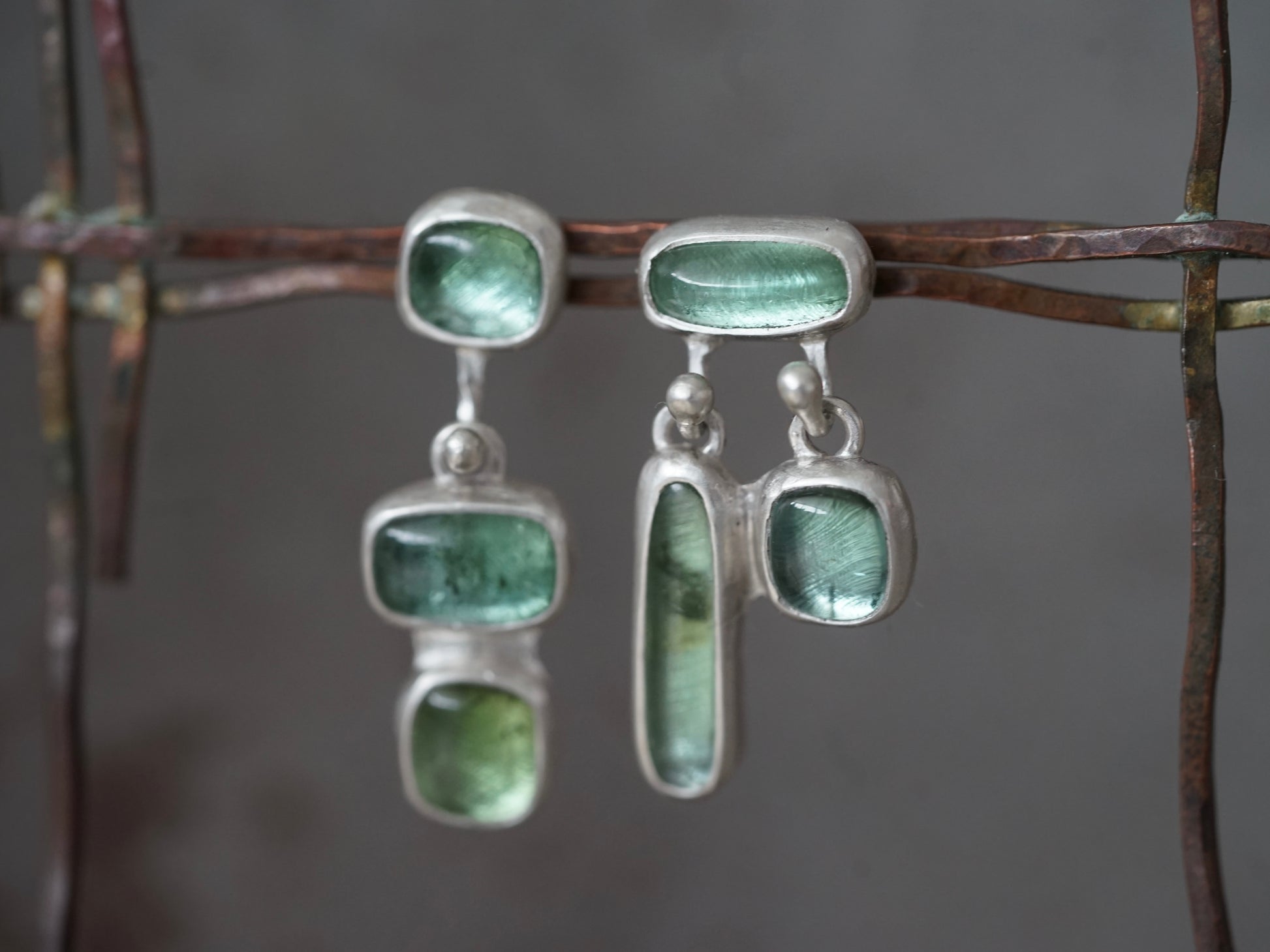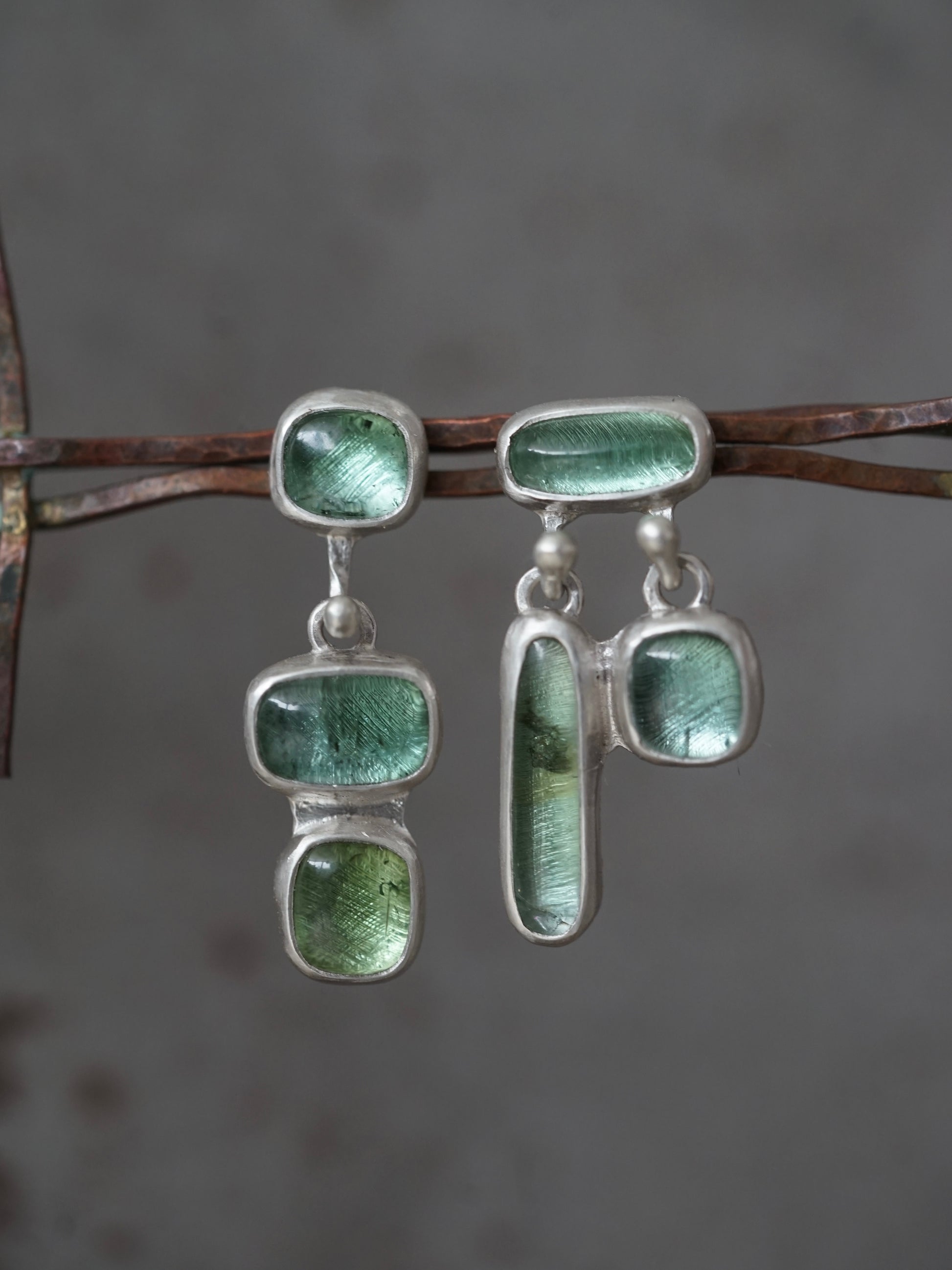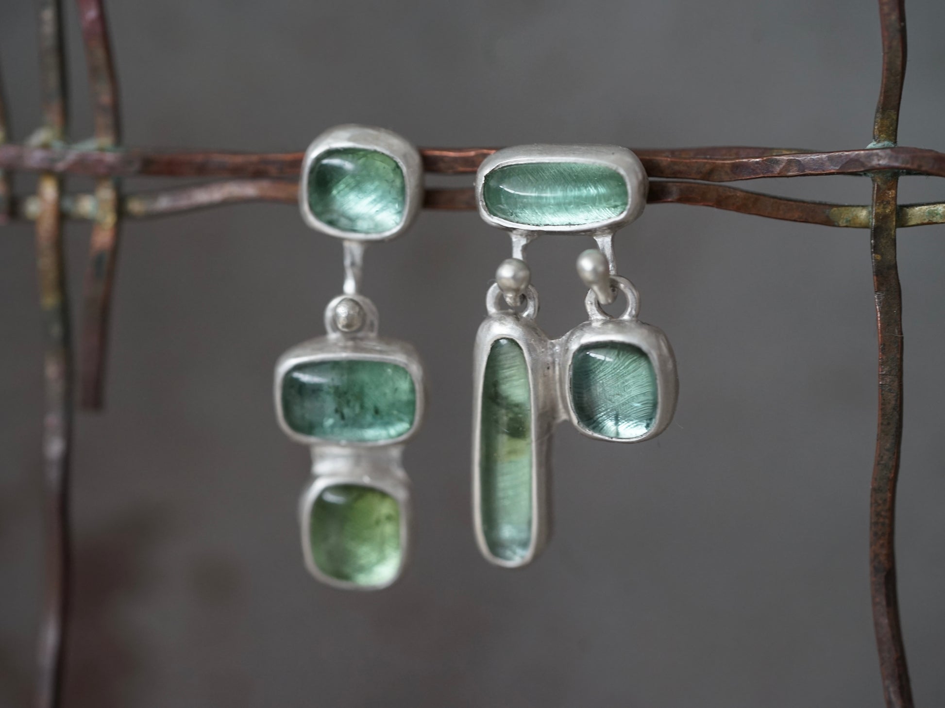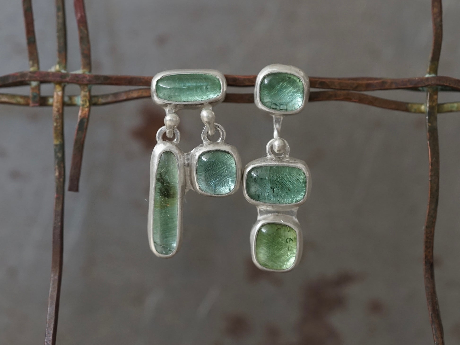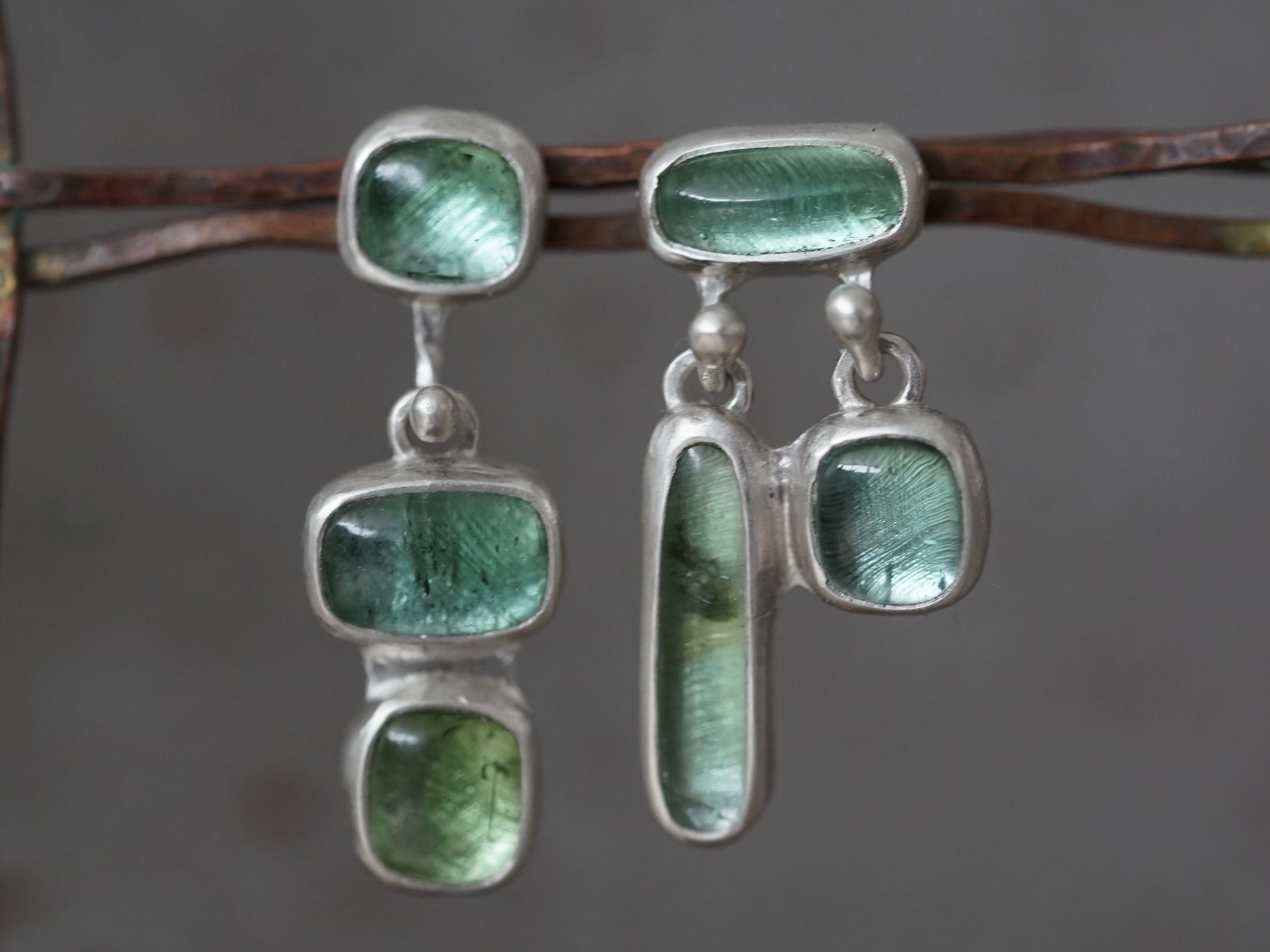Asymmetrical tourmaline sterling silver earrings, featuring 6 unique sea green cabochons.
