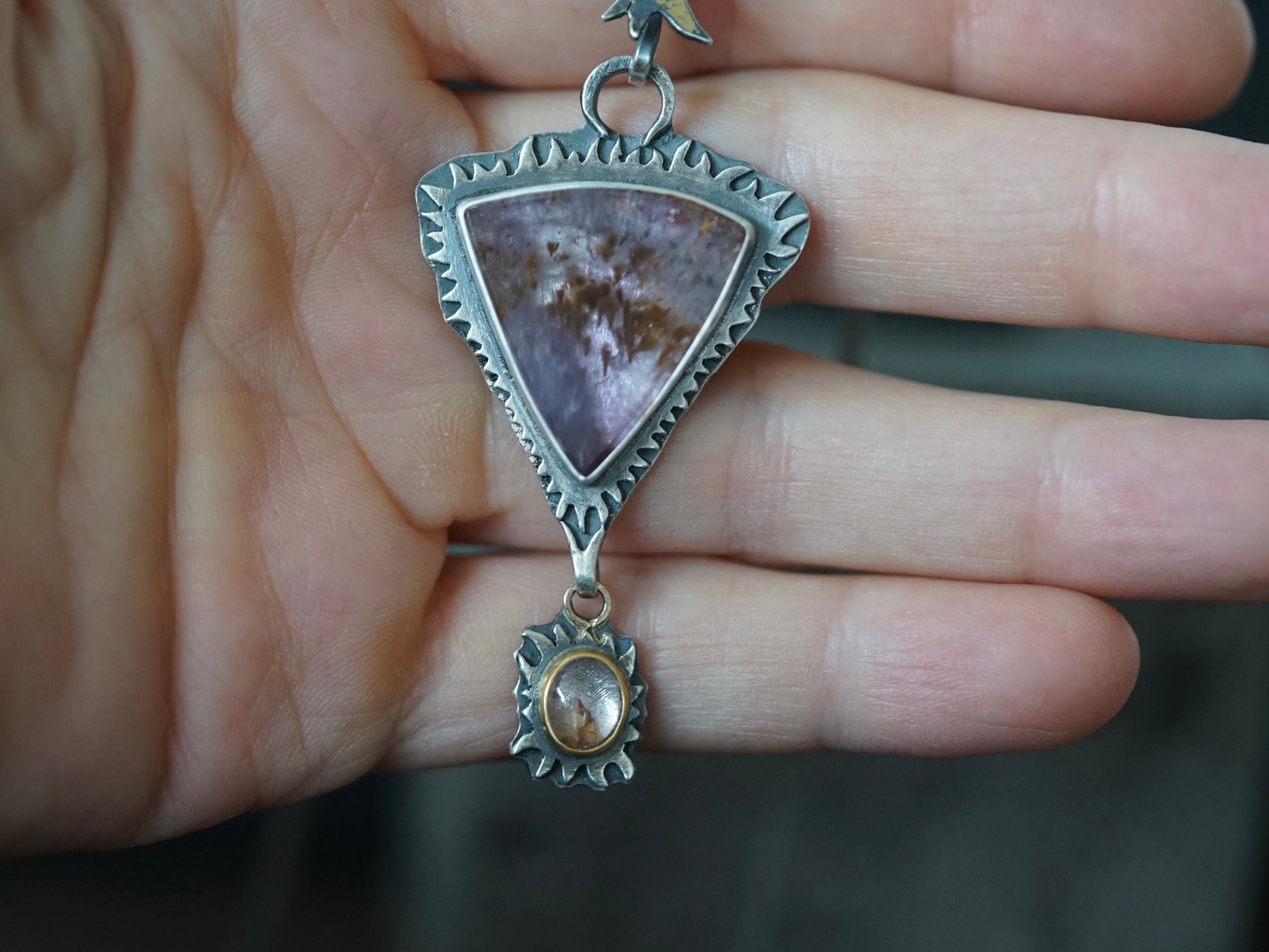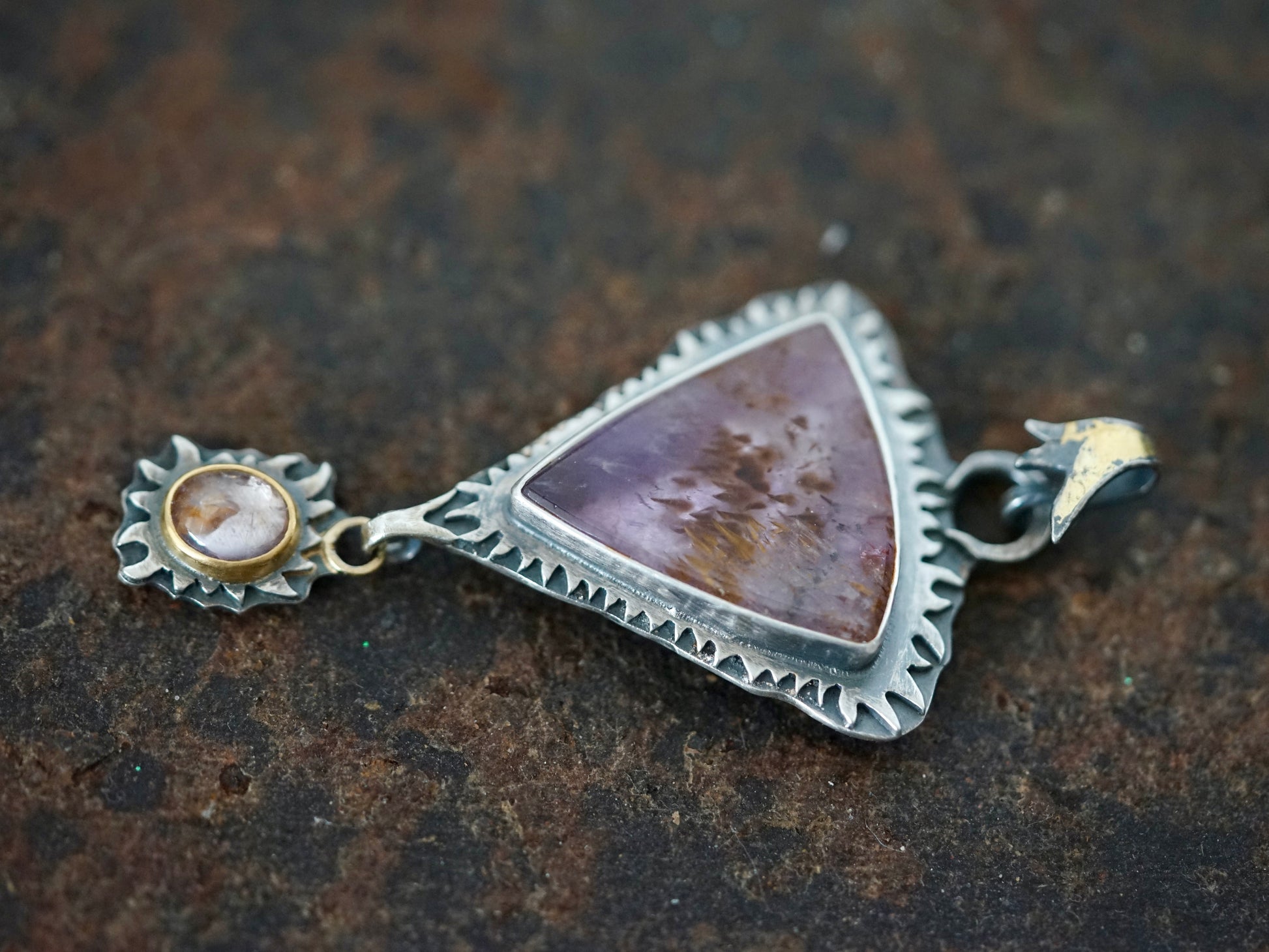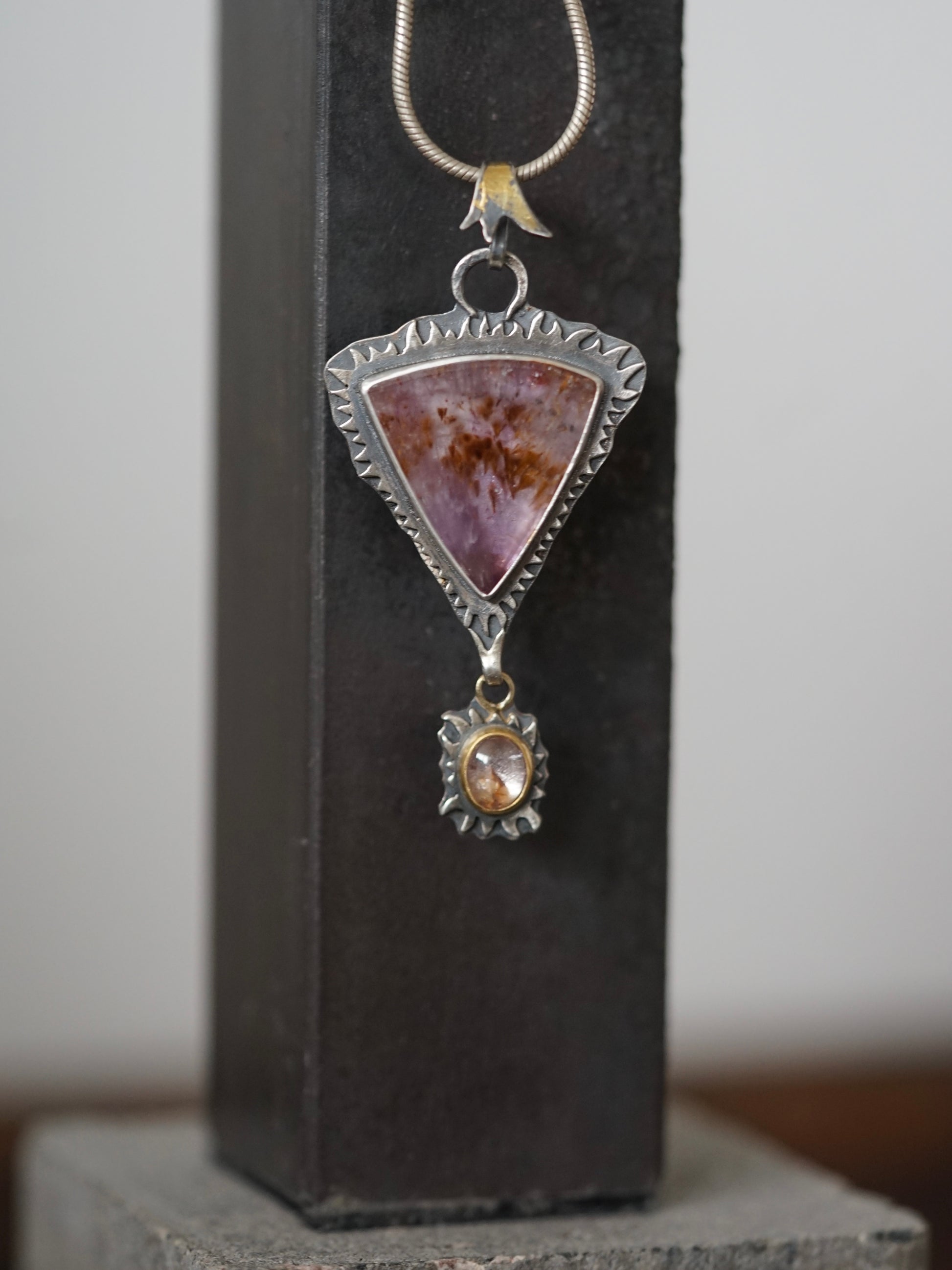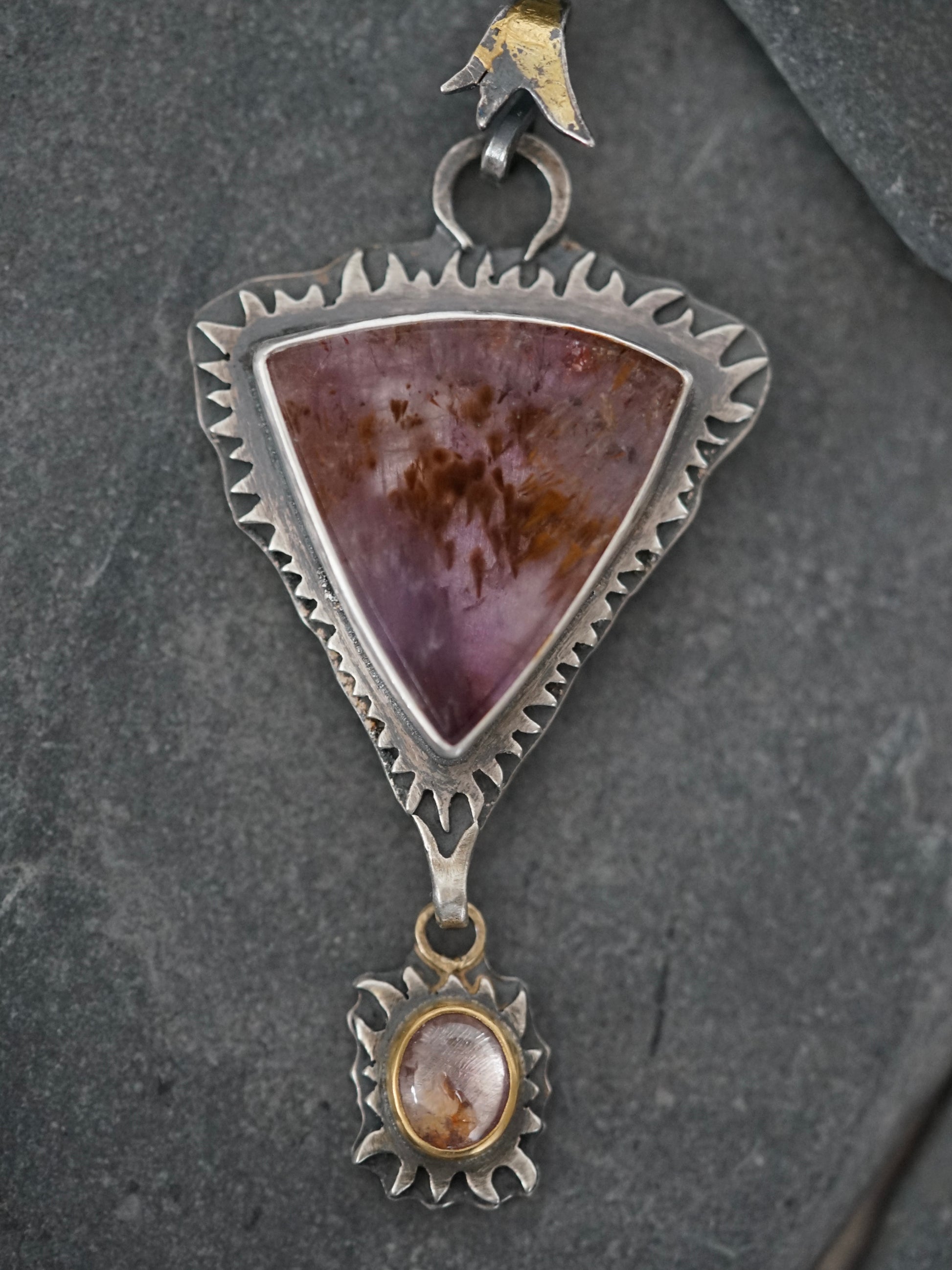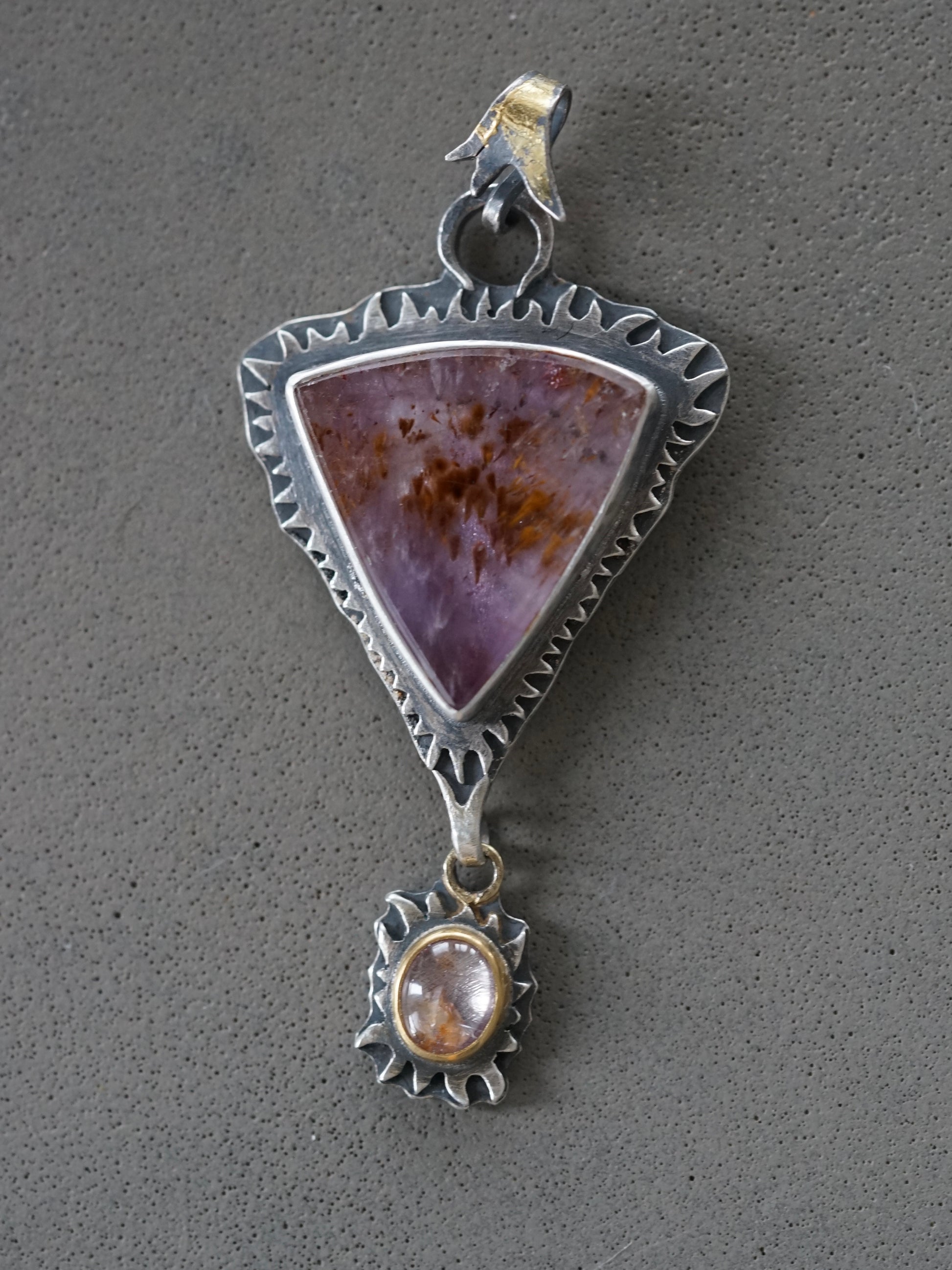 A gorgeous super 7 stone with lovely inclusions is the focal element, I combined it with a blush coloured sapphire, set in 22k gold. The stones are framed by playful, irregular sterling silver patterns, a matching bail completes the design. The back of this piece features an additional little design surprise. As most mazulou items this pendant is one of a kind.