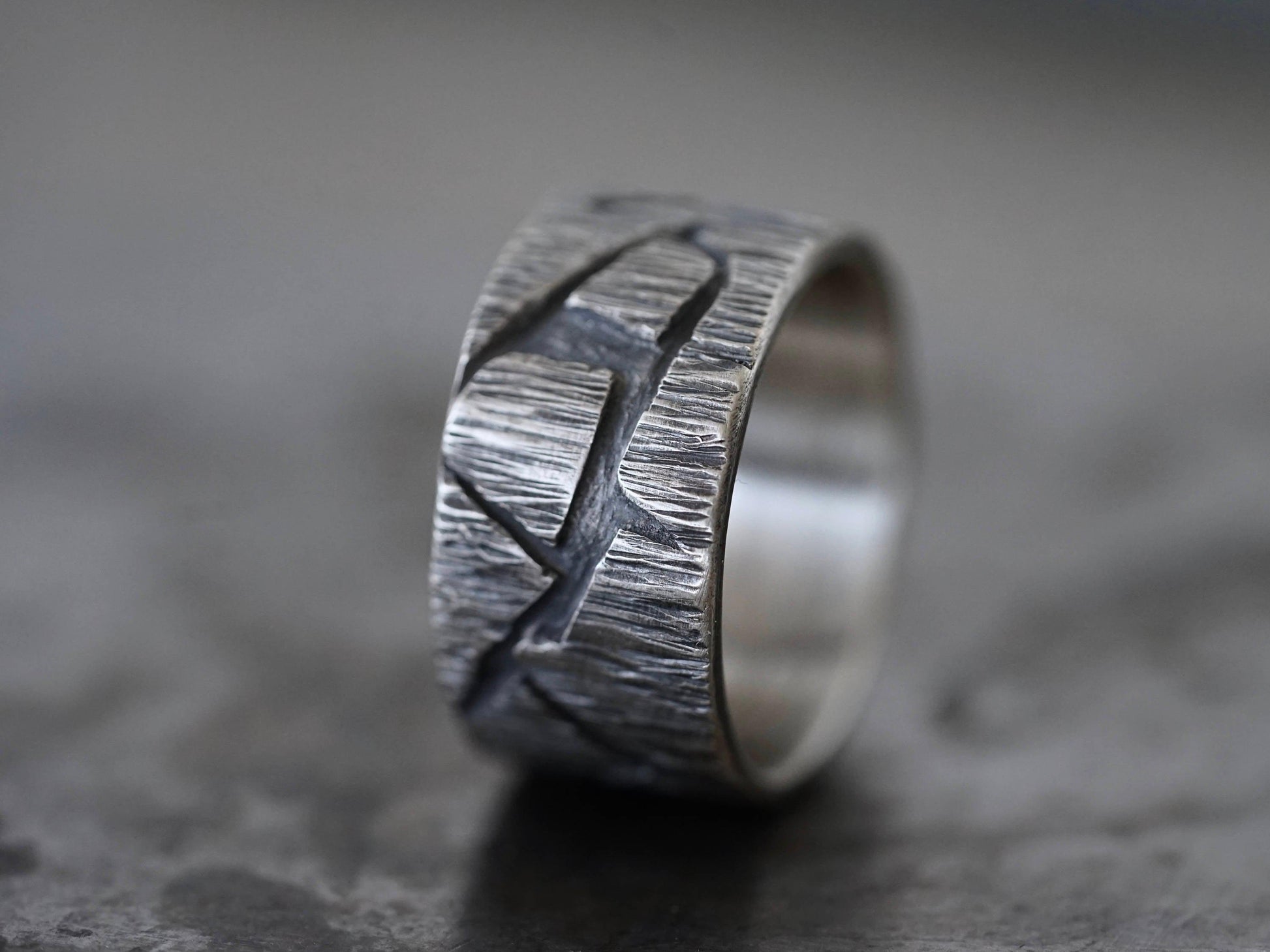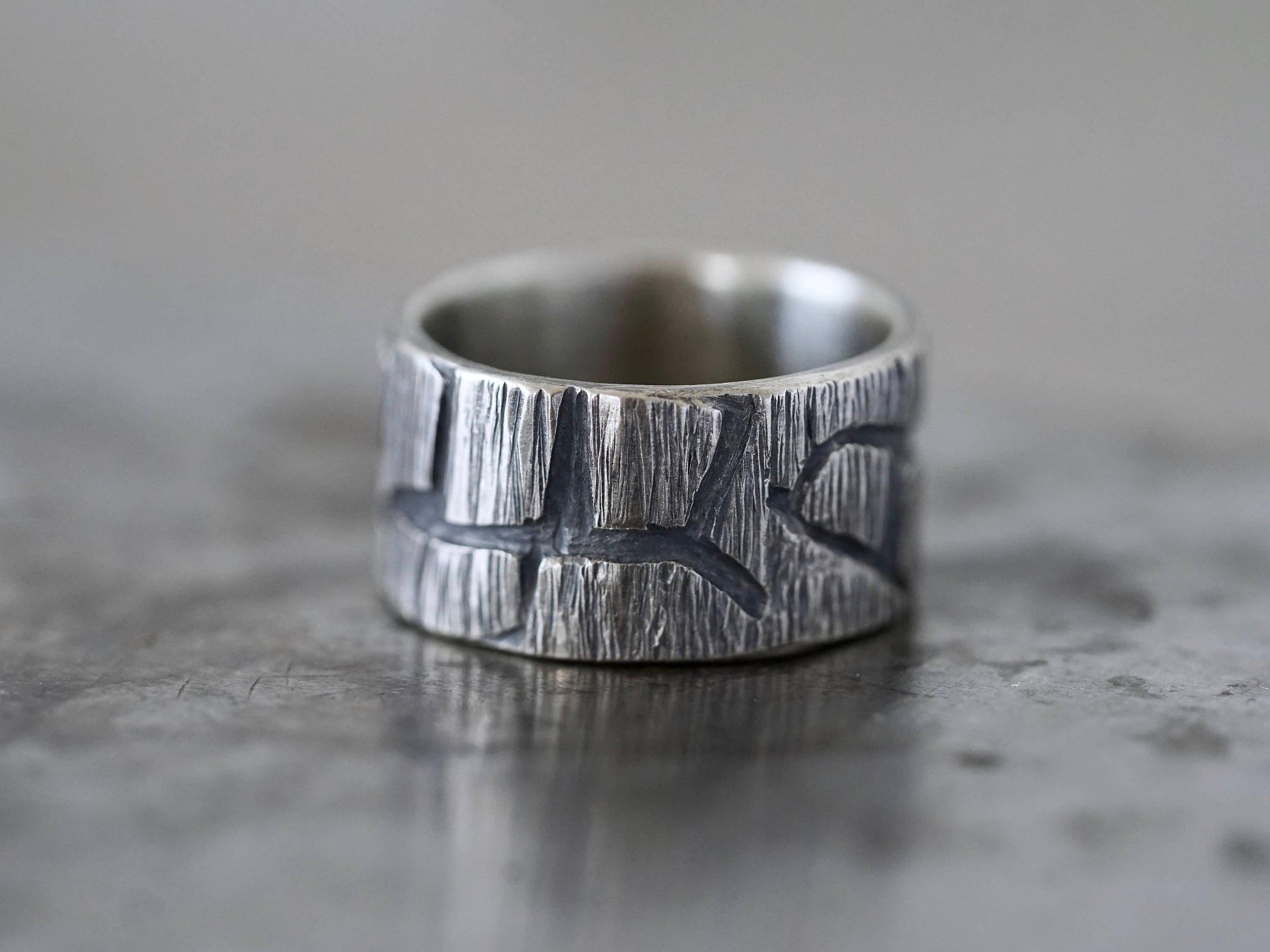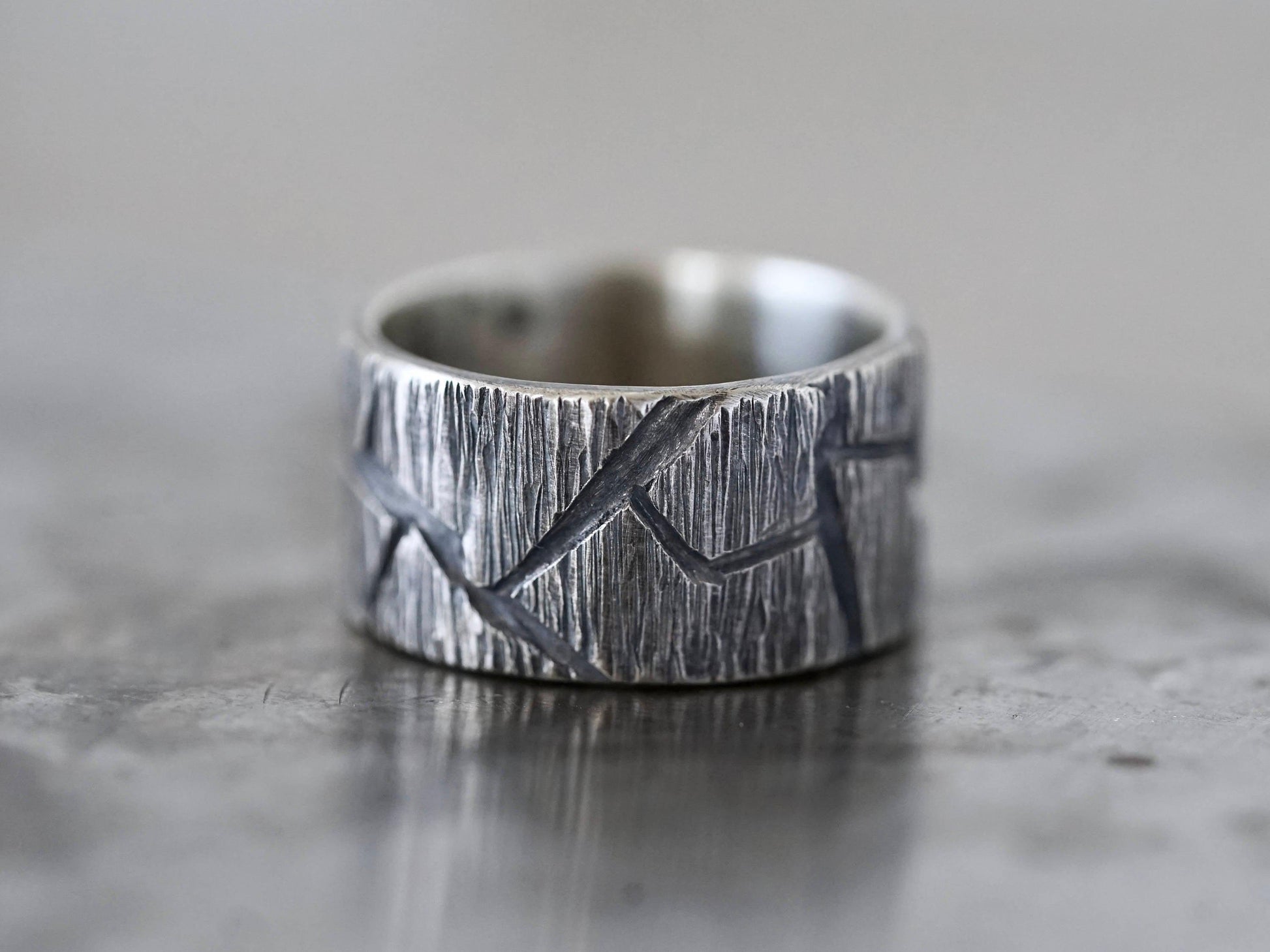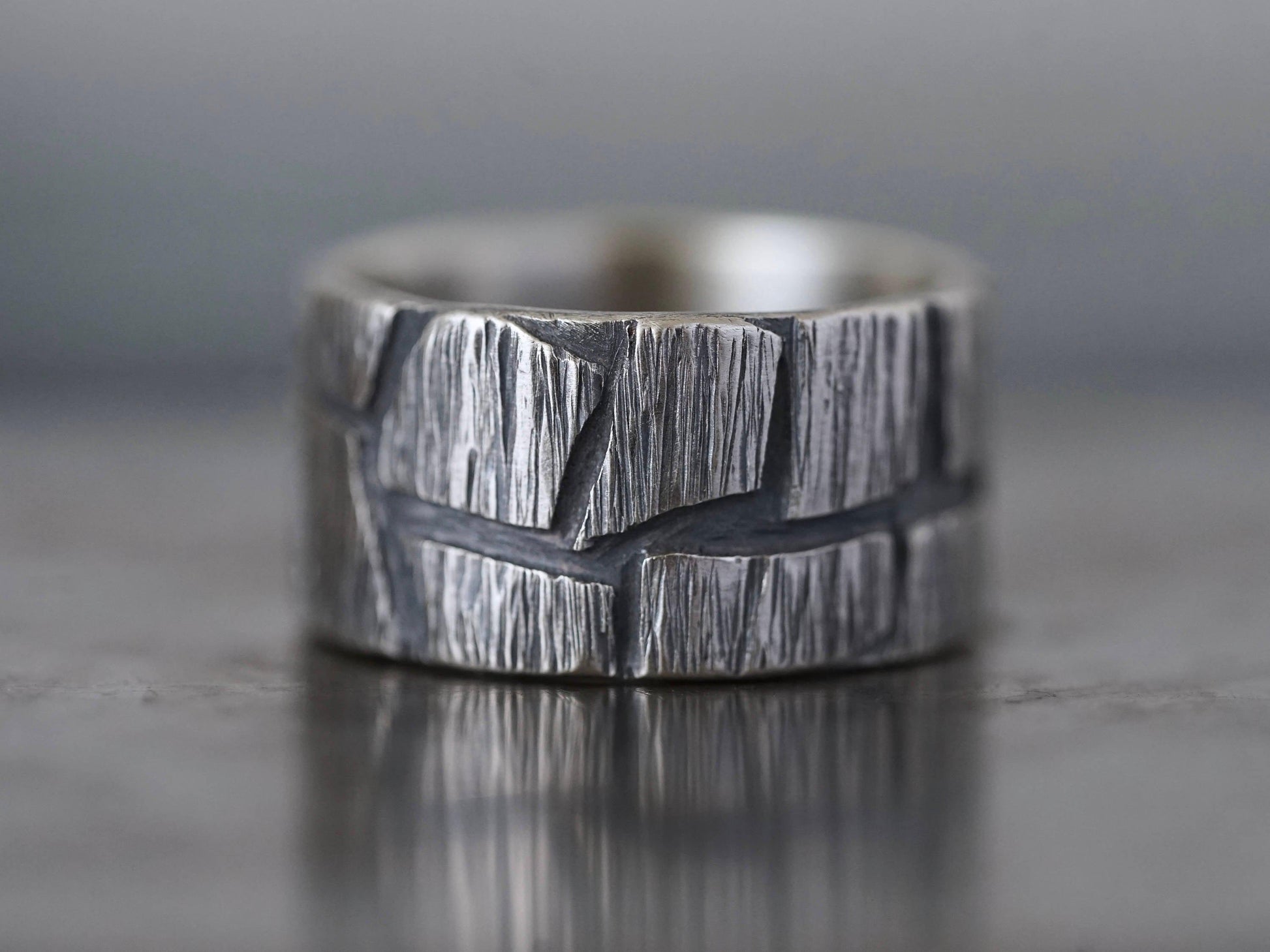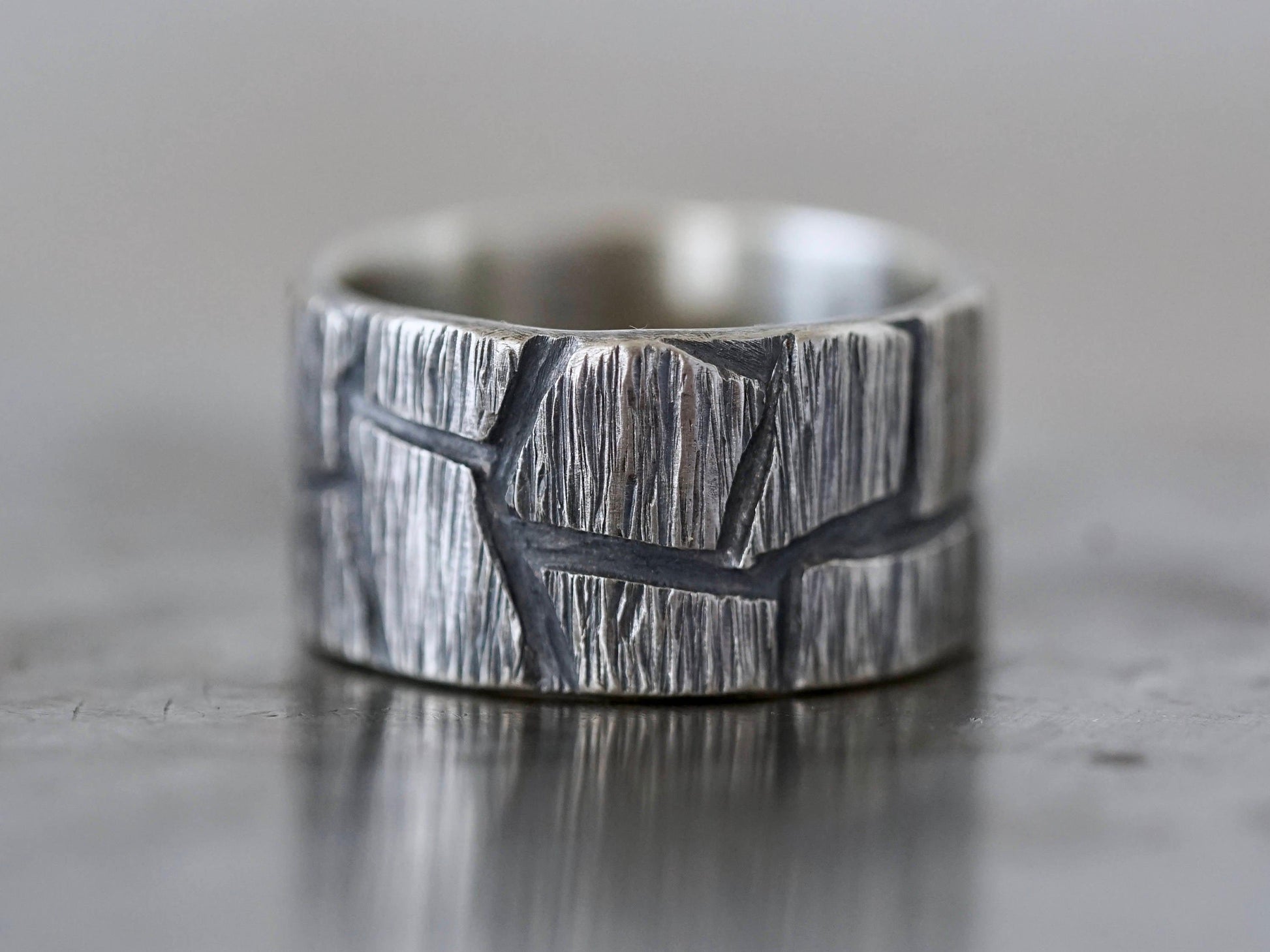 This is a rugged, sturdy, sterling silver ring, made by hand from recycled sterling silver. The unique pattern was created by layering jagged pieces of sterling silver on sheet. After forming the band, the surface was further shaped by hammering and carving, resulting in a raw, untamed look with a sculptural feel. The band was oxidised to accentuate the contrasting textures, the inside was polished to a smooth finish. This ring is a unisex design and would look great as a partner ring or an alternative wedding band.