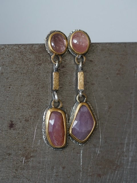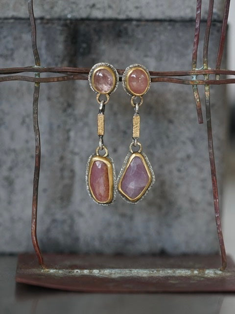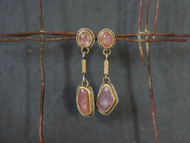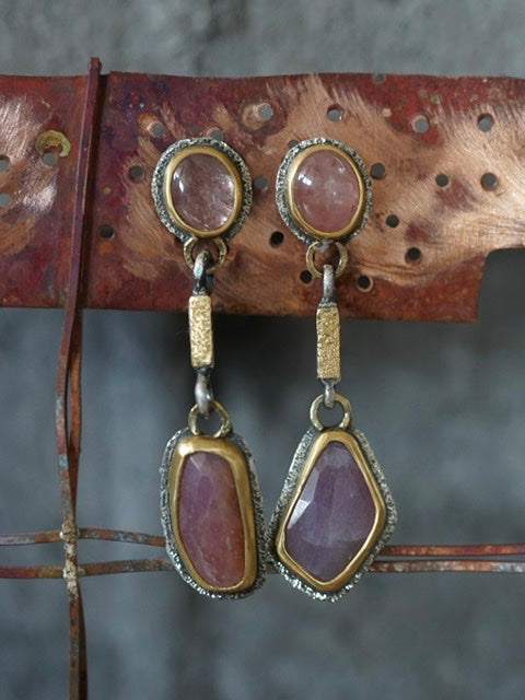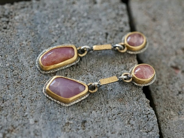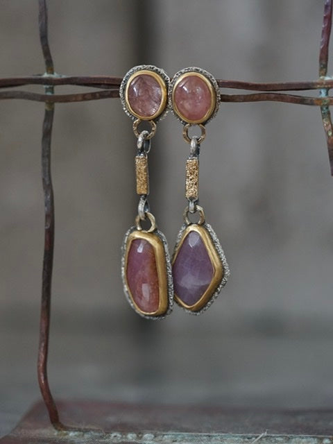These earrings feature four sapphires in different shades of dusty raspberry red with warmer undertones as focal elements. The beautiful colours are complemented by the deep gold tones of the settings and golden accents. The rich texture of the metal adds a lovely sparkle to the design. The overall look is rich, opulent and glamorous with an organic and earthy feel.