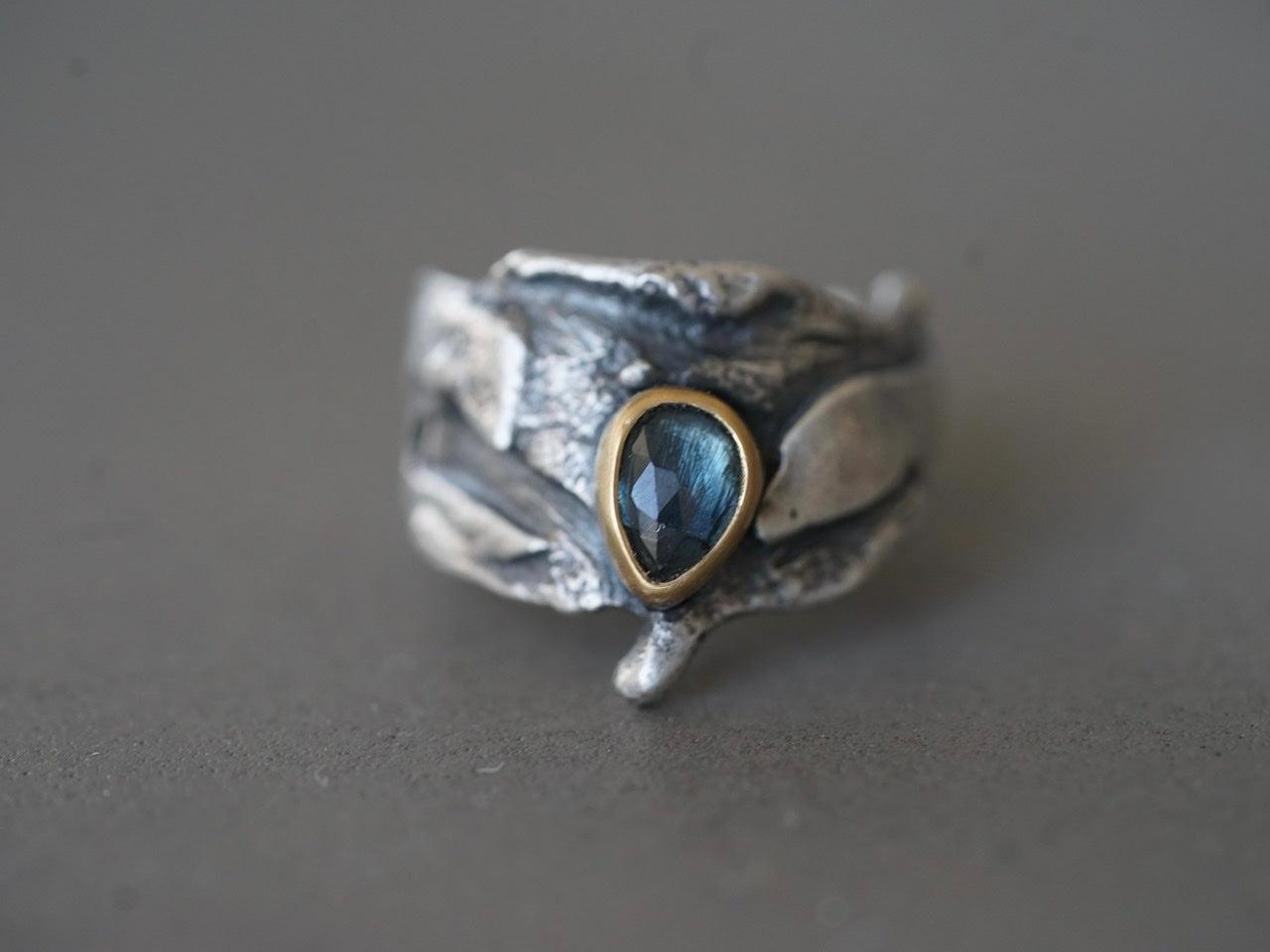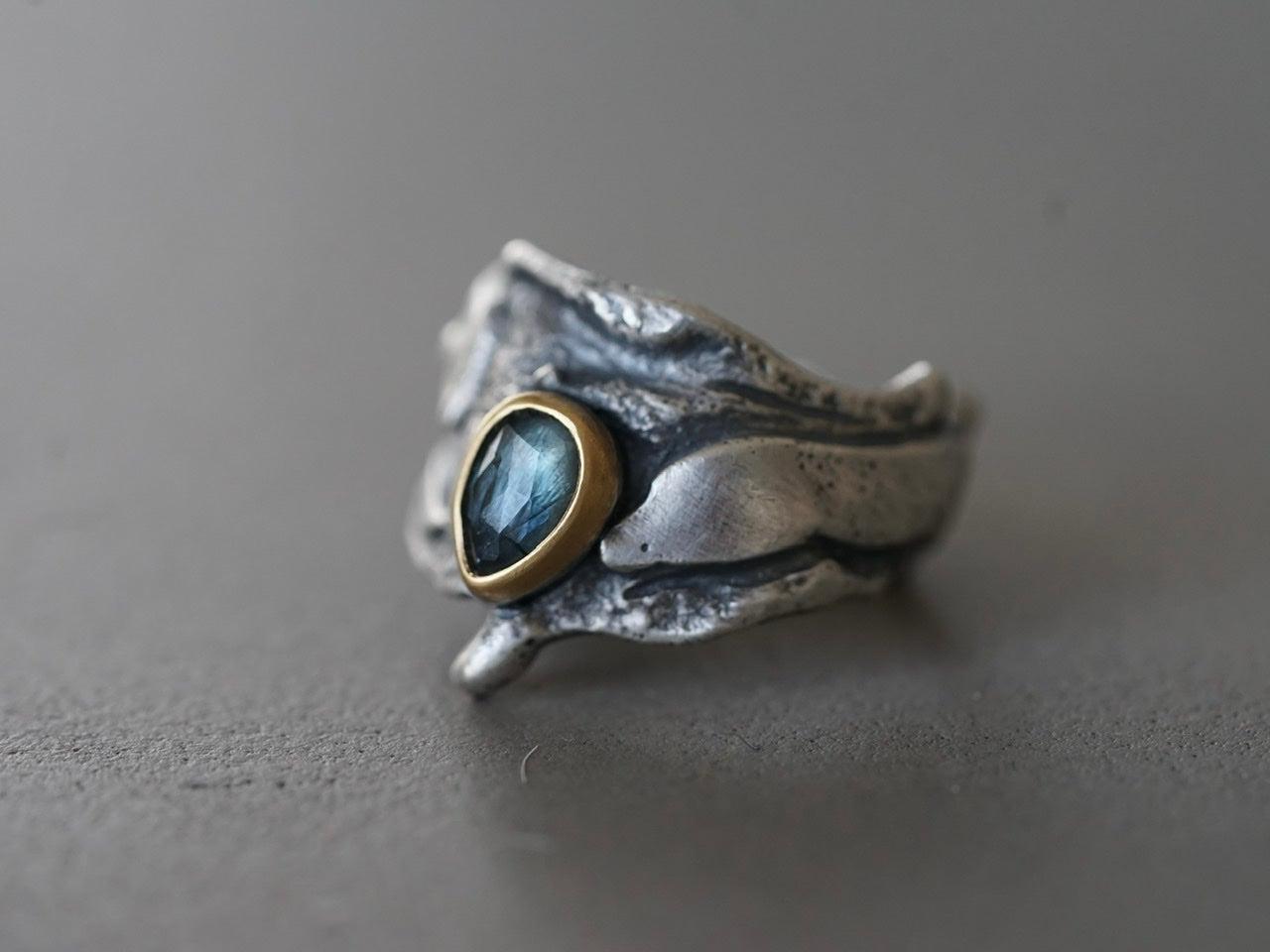 The most wonderful tear shaped teal blue sapphire set in 22k gold is the focal element of this one of a kind ring. A richly textured and layered band creates the perfect backdrop.This ring was oxidized to enhance the surface structure and is very comfortable to wear