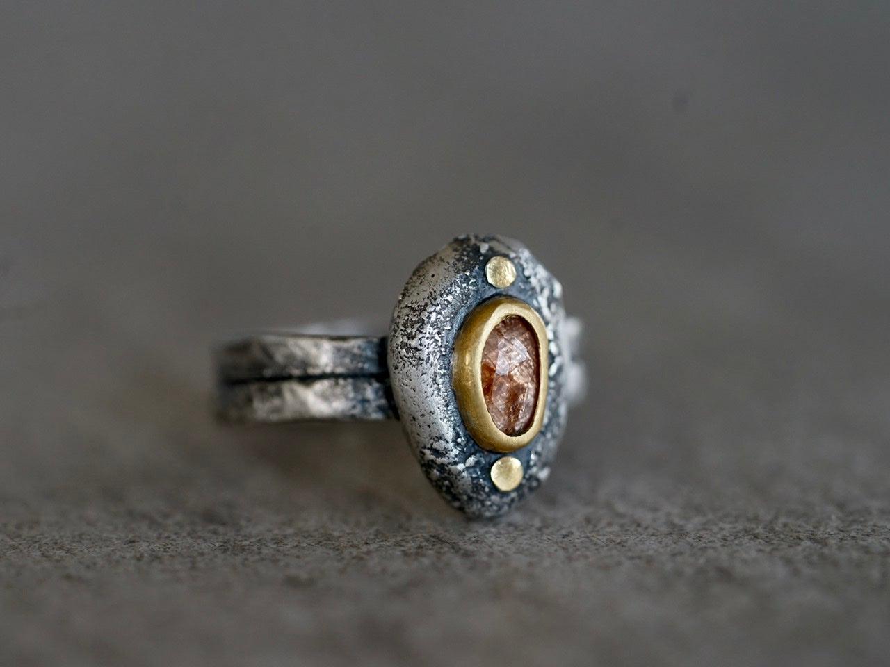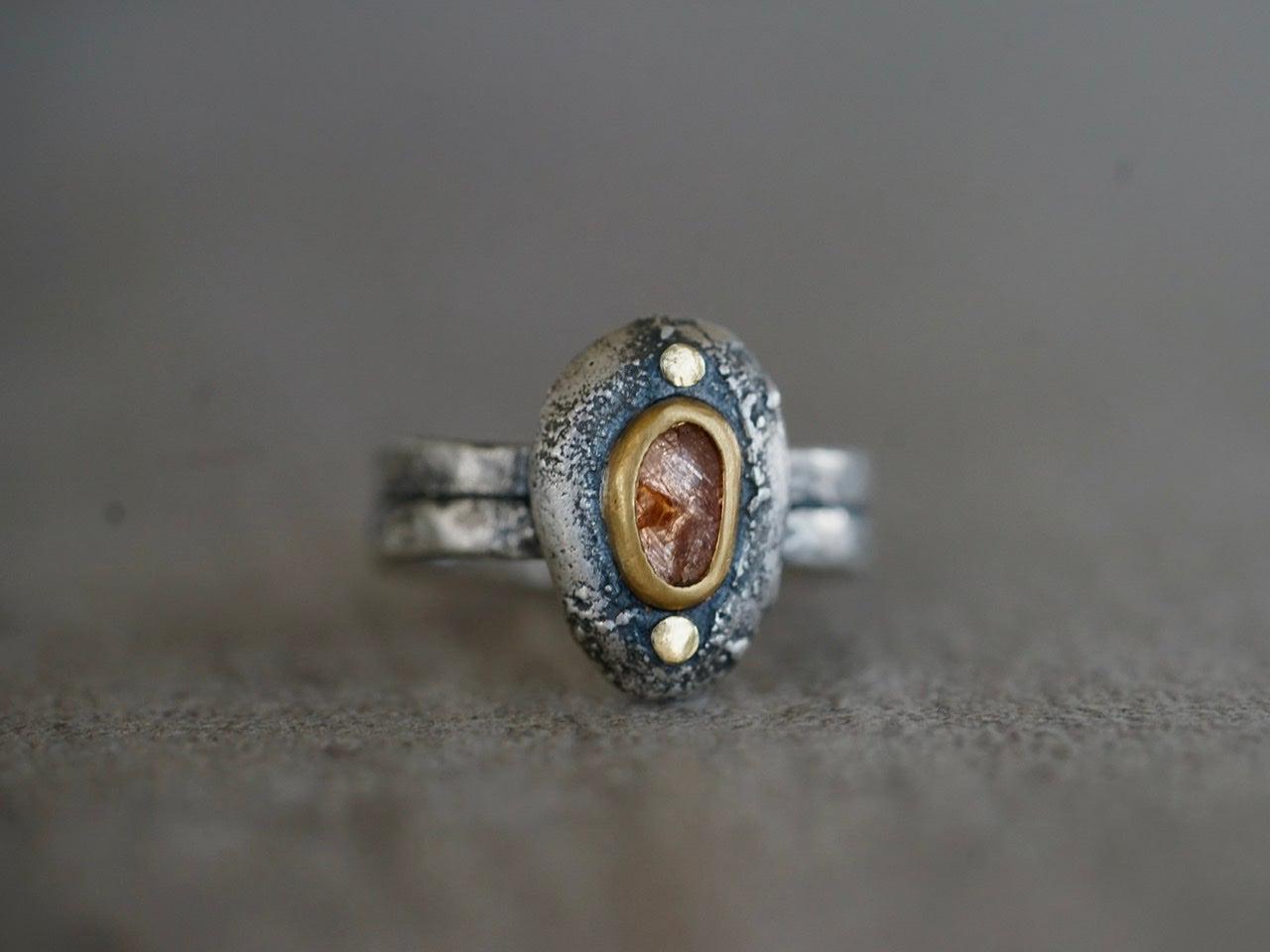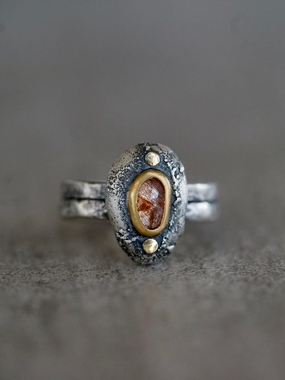 A sterling silver pebble with a richly textured surface was the starting point for this design. The dusty red spinel, set in 22k gold, contrasts beautifully with the rugged surface of the silver. I added two 22k gold dots to visually anchor the stone. This ring is held in place by a textured sterling silver double band.