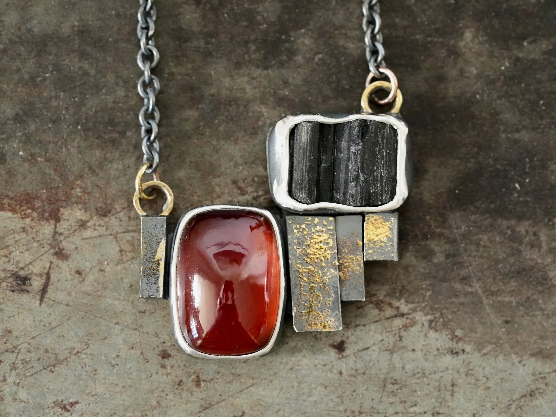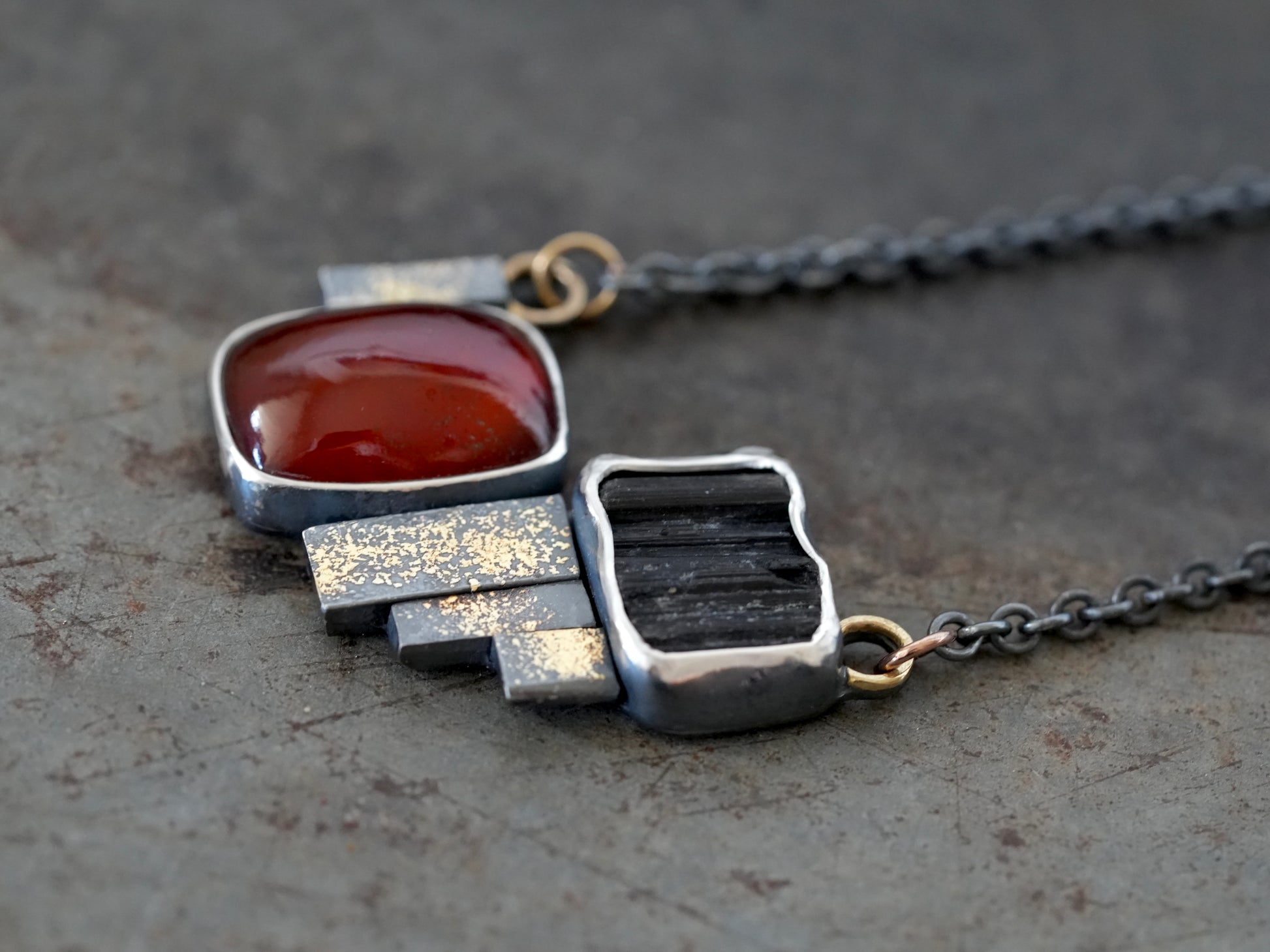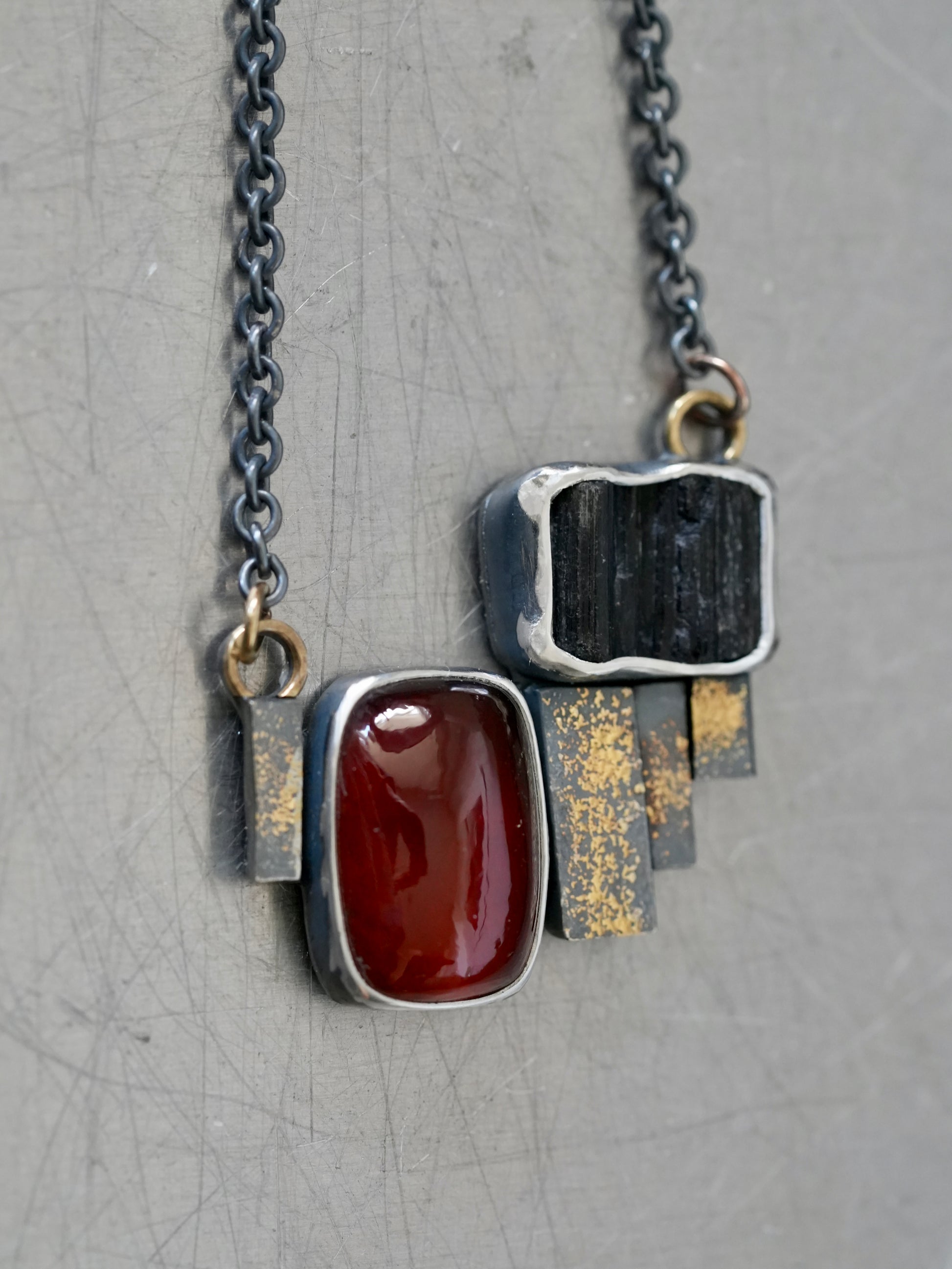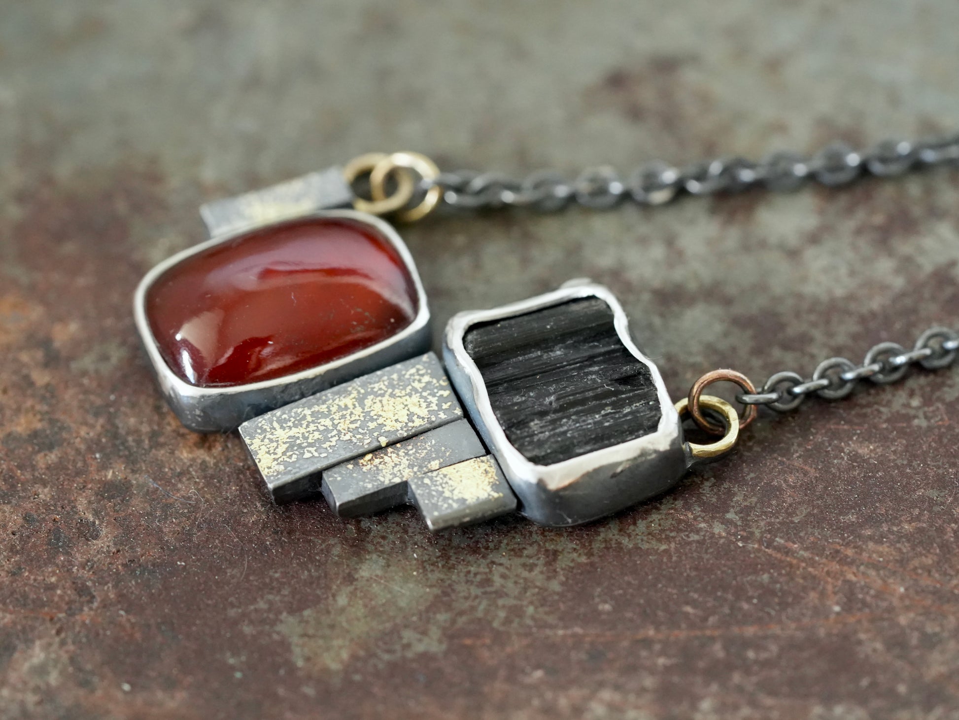 This unique statement necklace features a deep red garnet, combined with an uncut, raw black tourmaline. The two stones are connected by darkened silver elements, embellished with fused gold dust. Golden jump rings link the central element to a blackened sterling silver chain, the necklace is closed with a hand forged clasp.