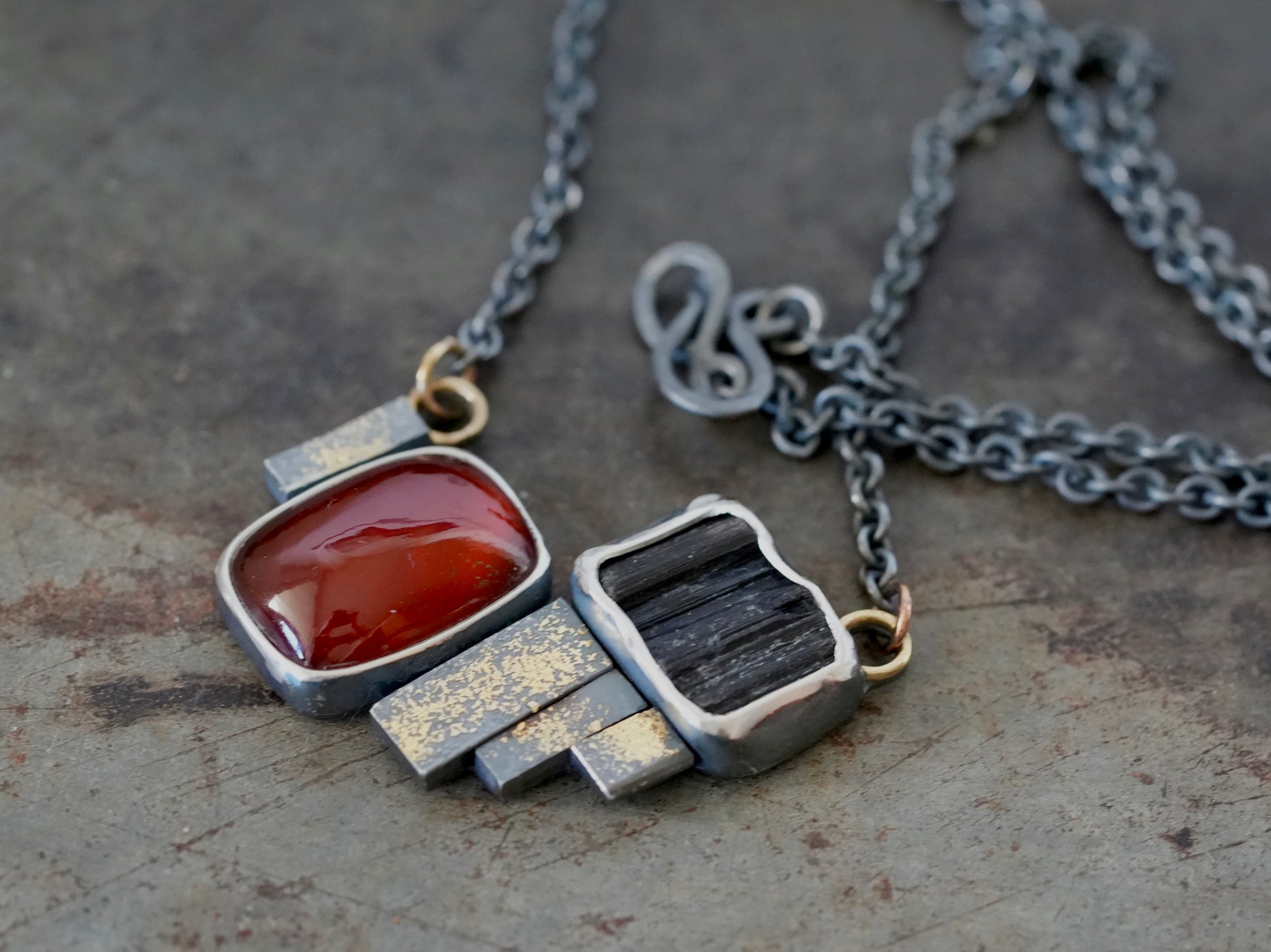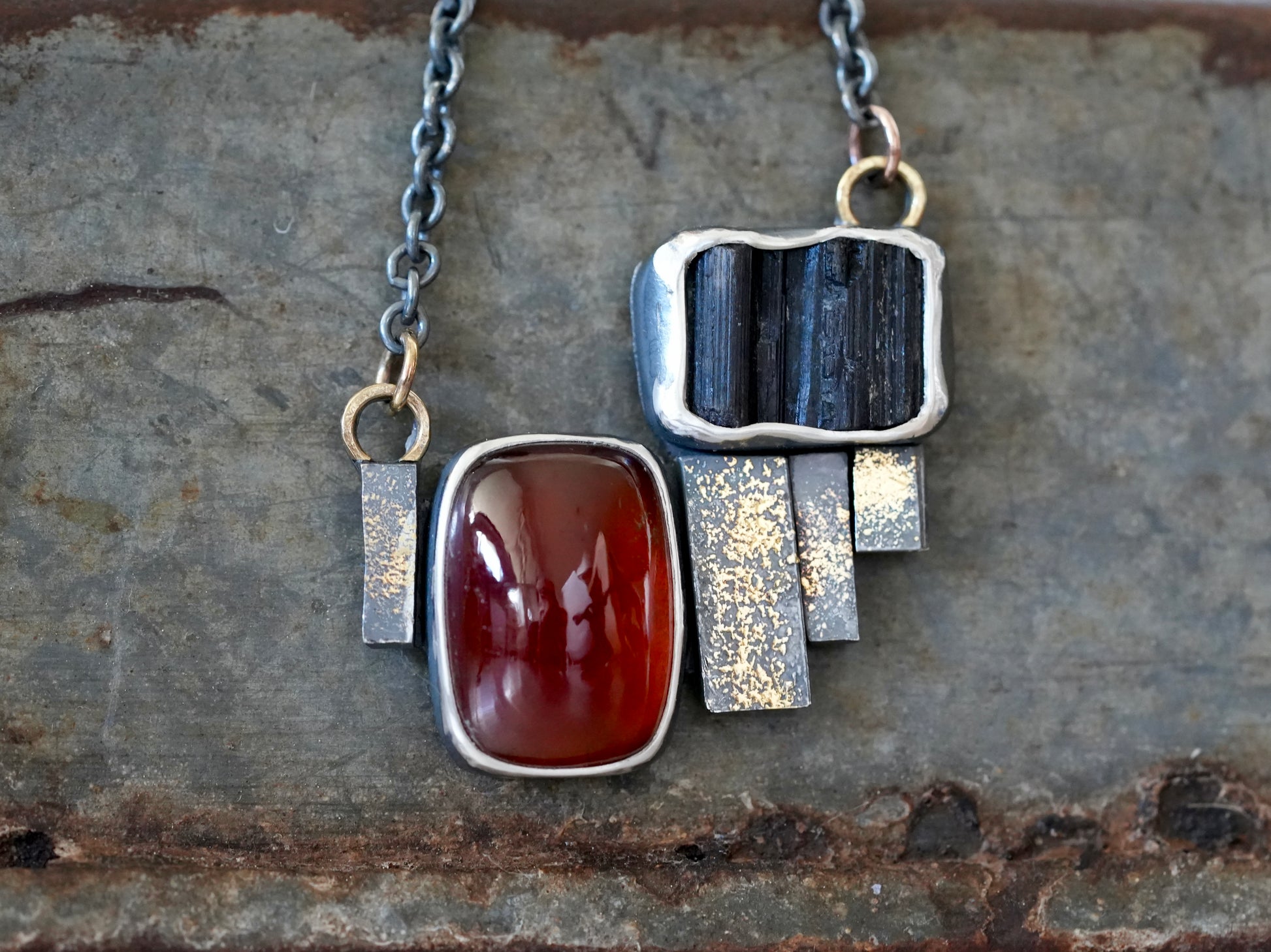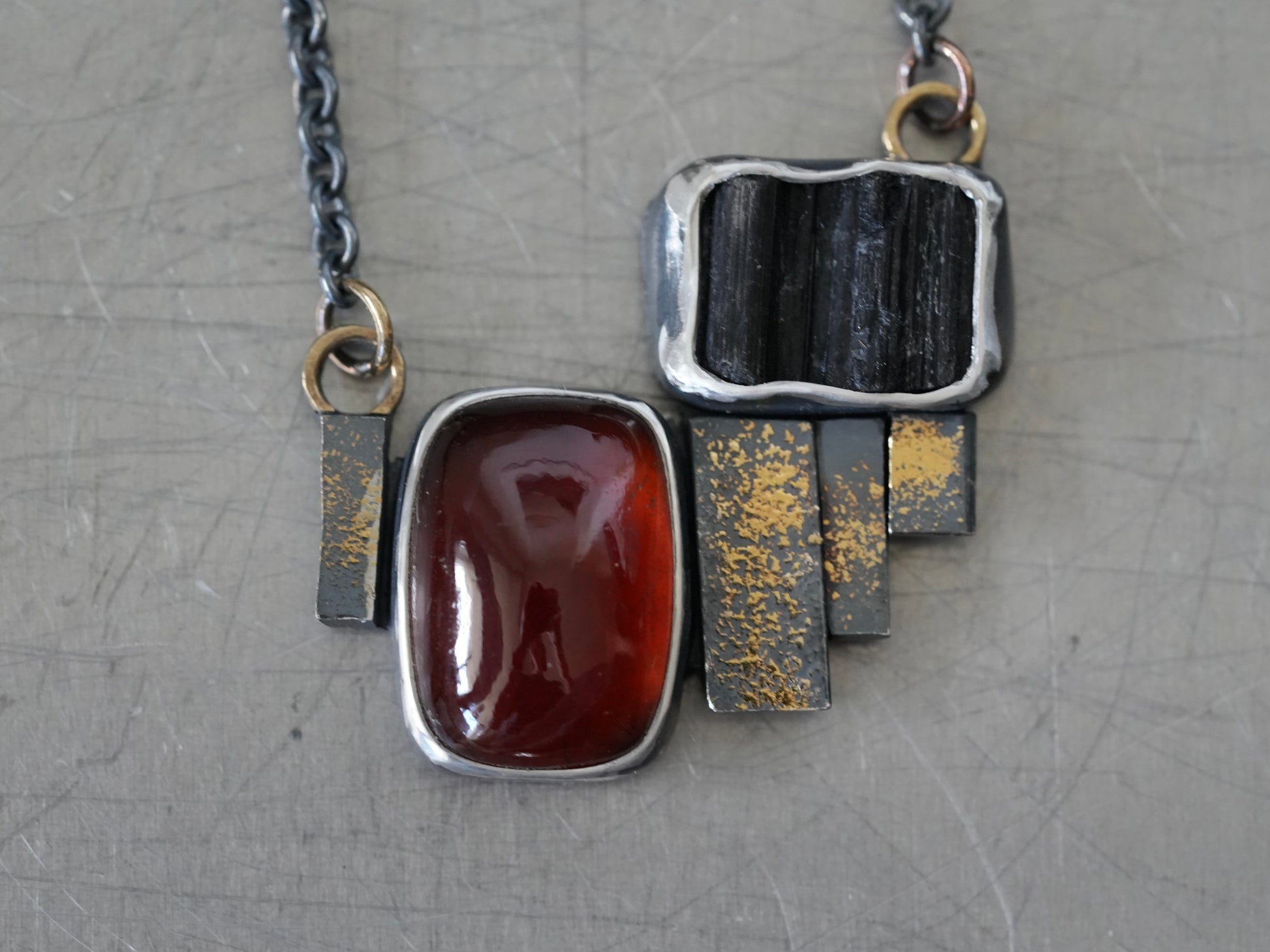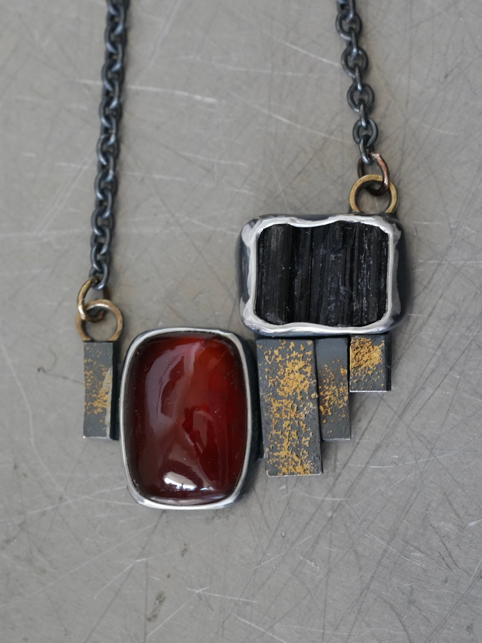 This unique statement necklace features a deep red garnet, combined with an uncut, raw black tourmaline. The two stones are connected by darkened silver elements, embellished with fused gold dust. Golden jump rings link the central element to a blackened sterling silver chain, the necklace is closed with a hand forged clasp.