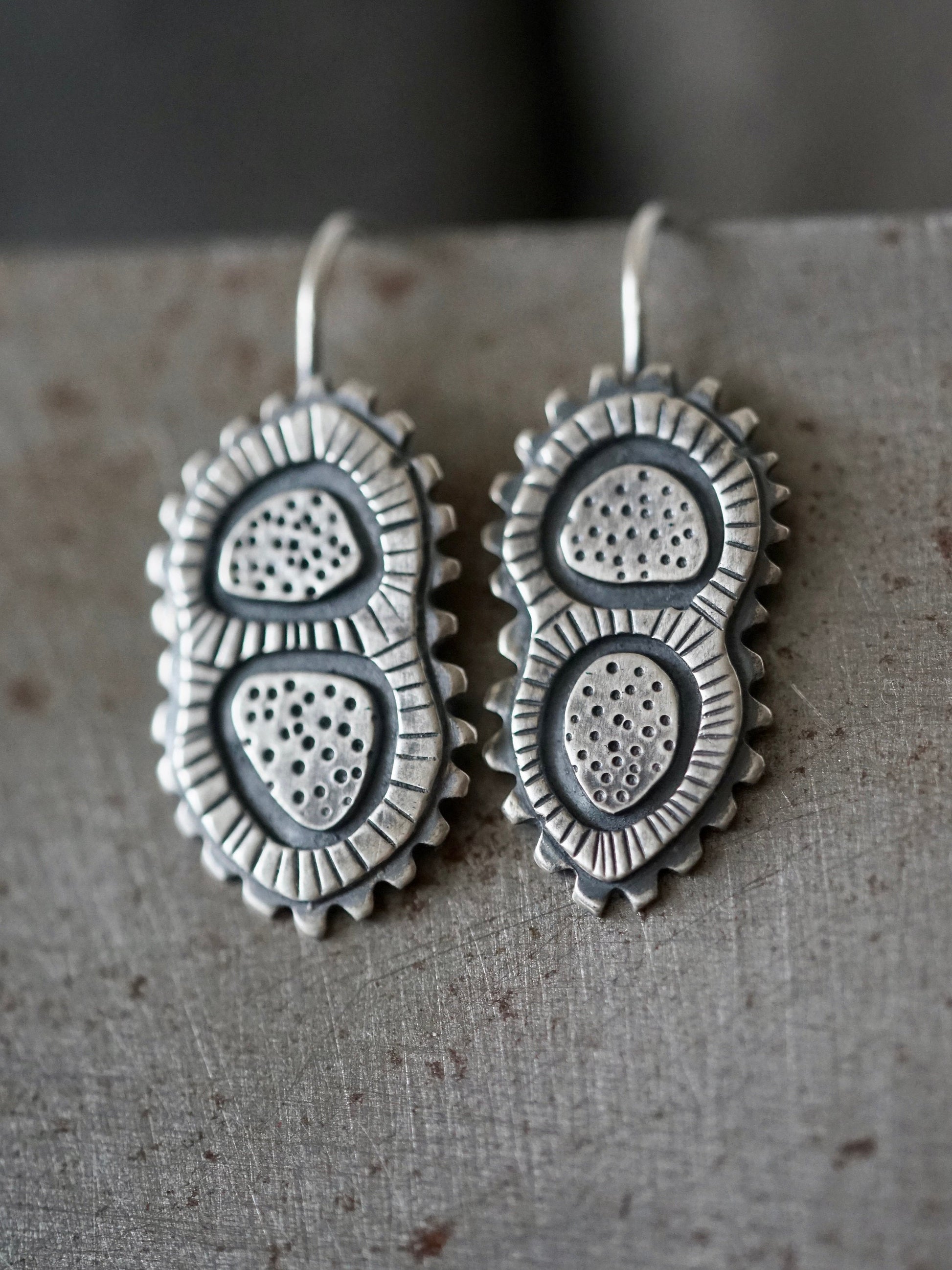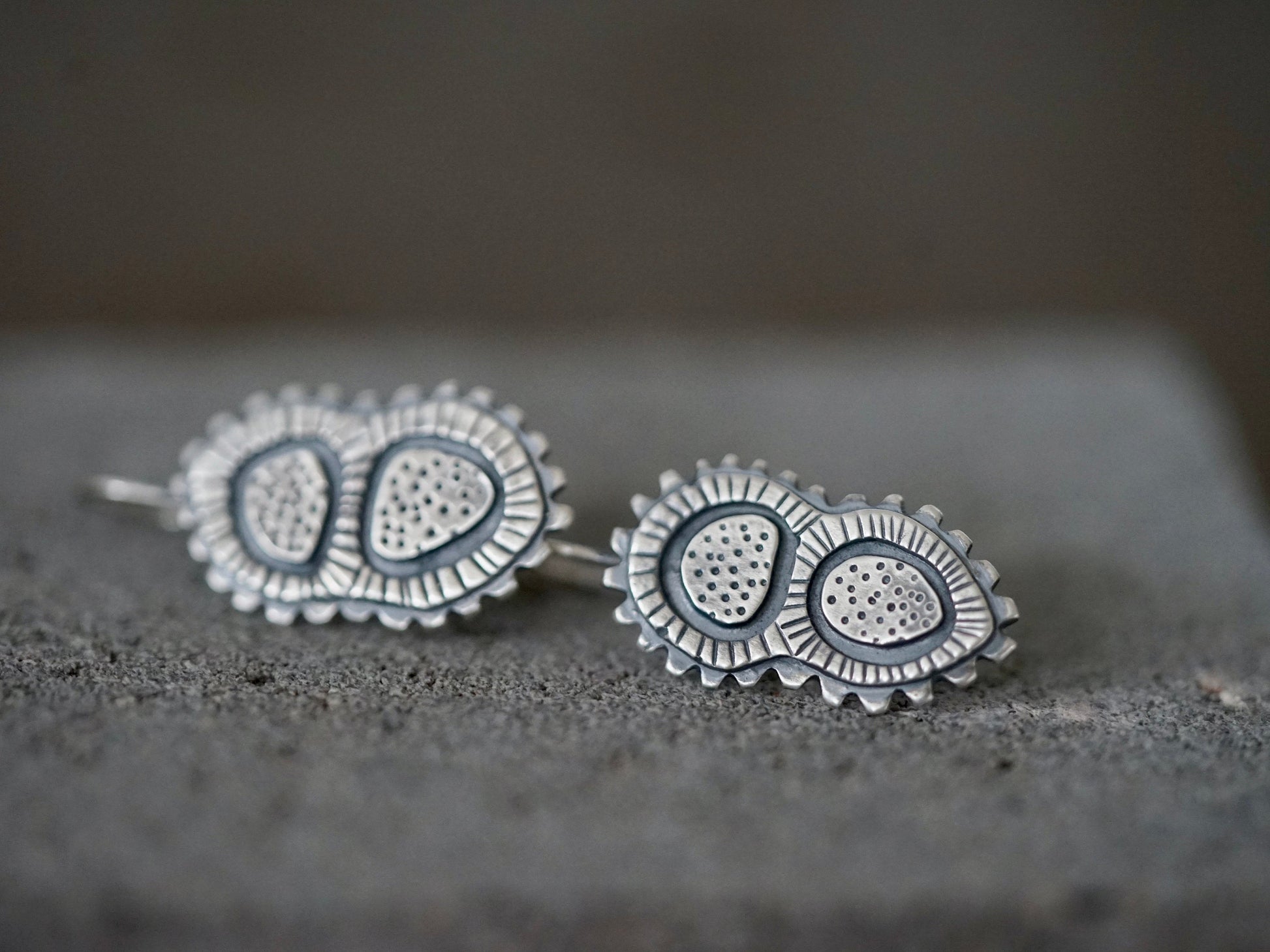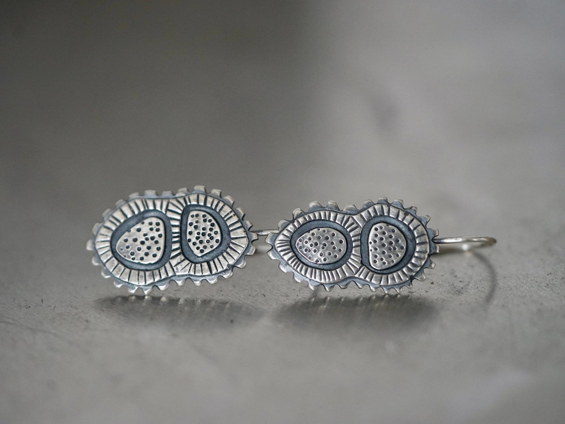 These unique earrings were inspired by the word of microorganisms and handcrafted by me in my studio. This little series is based on the doodle sketch you can see at the end of the photo section: this loose interpretations of shapes and elements found in the microscopic world of bacteria, protozoa and algae was recreated in sterling silver. When starting the project I hadn't decided what kind of jewellery these little forms should be, while working on them it became clear that they should be earrings: slightly asymmetrical sisters not twins, each with a decidedly organic feel, with richly textured layers and an ornamental look. They are fastened with earwires, were oxidised to accentuate the texture and are stamped with my makers mark. I think they are fabulous (but as an infectious disease doctor I might be slightly biased :-) ).