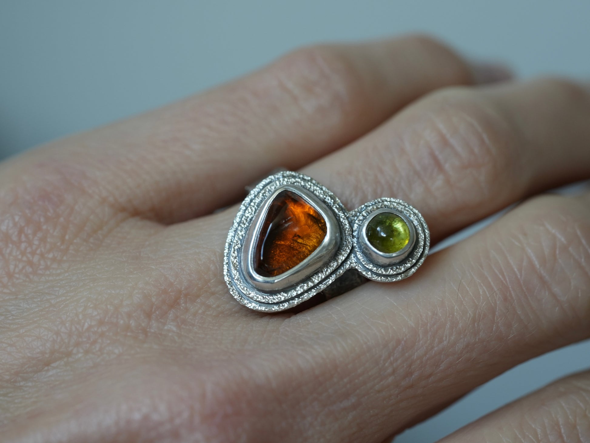 A raw hessonite garnet meets a green tourmaline cabochon on a layered and textured sterling silver setting. The band was textured by stone imprints, its width gives this ring a solid and secure feel. as most mazulou items this piece is one of a kind.