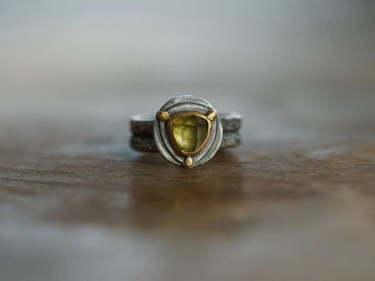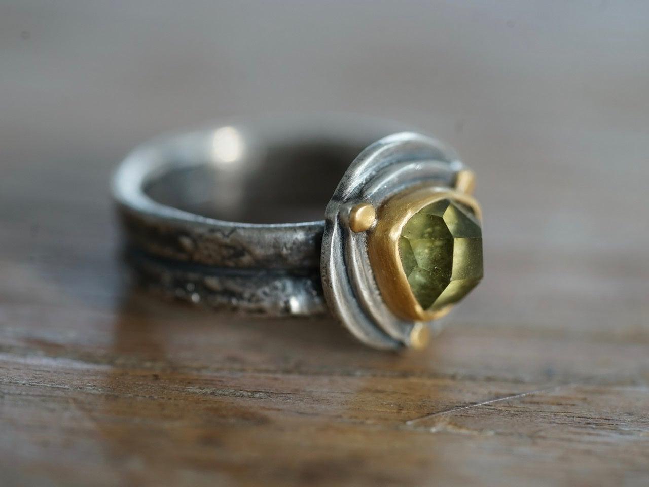 It features a light green, faceted tourmaline, set in 22k gold on a layered, gold embellished sterling silver backplate. The double band is textured and gives this ring additional dimension. Combining the light airy sparkle of the stone with the rustic design adds a certain tension that I find interesting and very appealing.