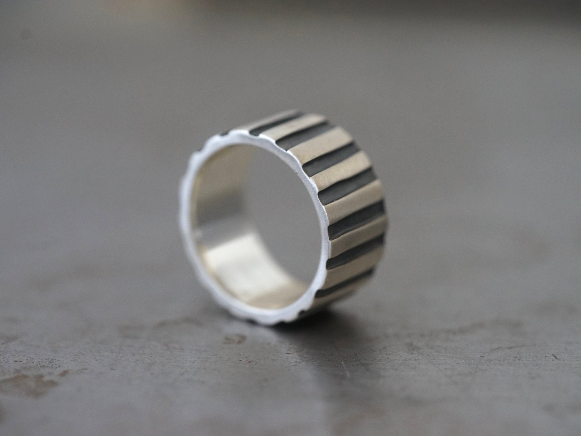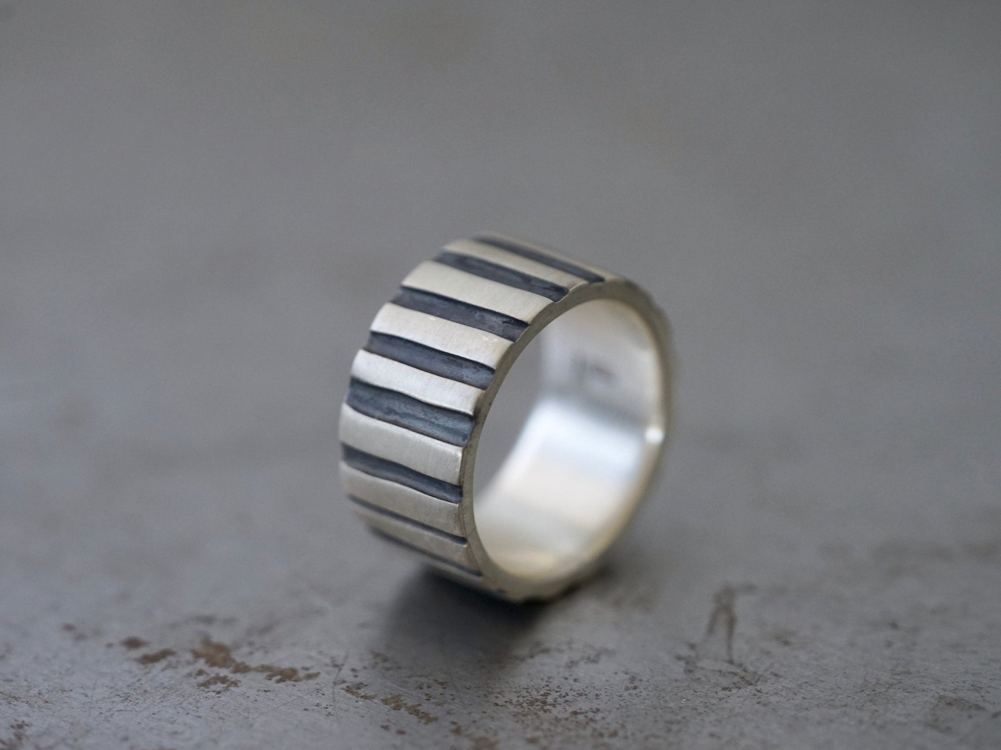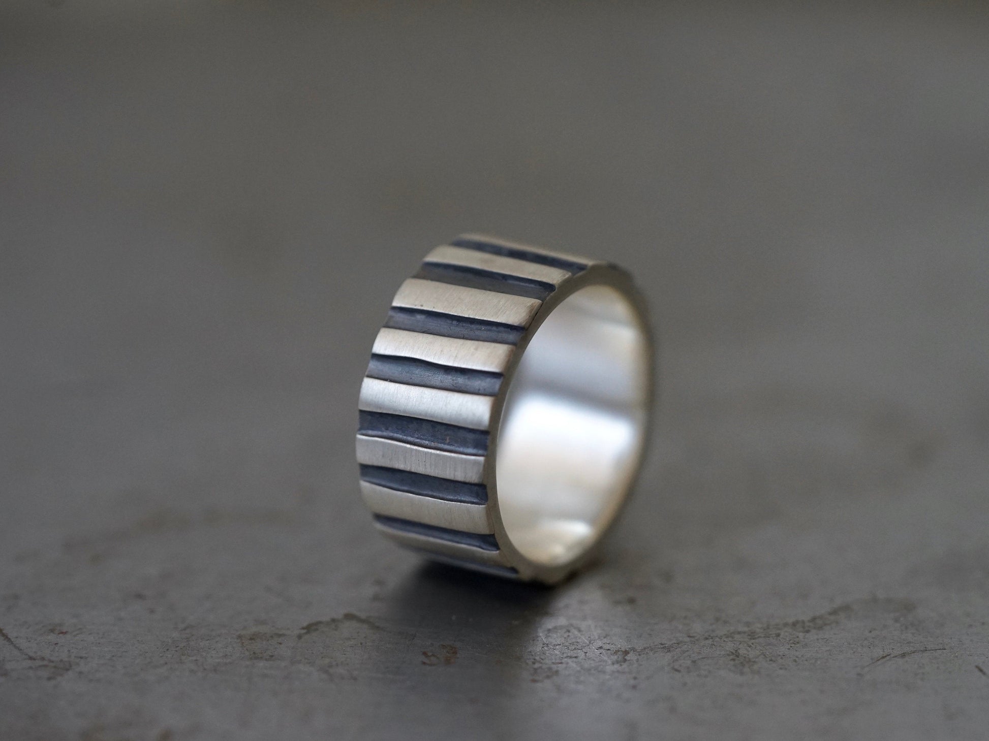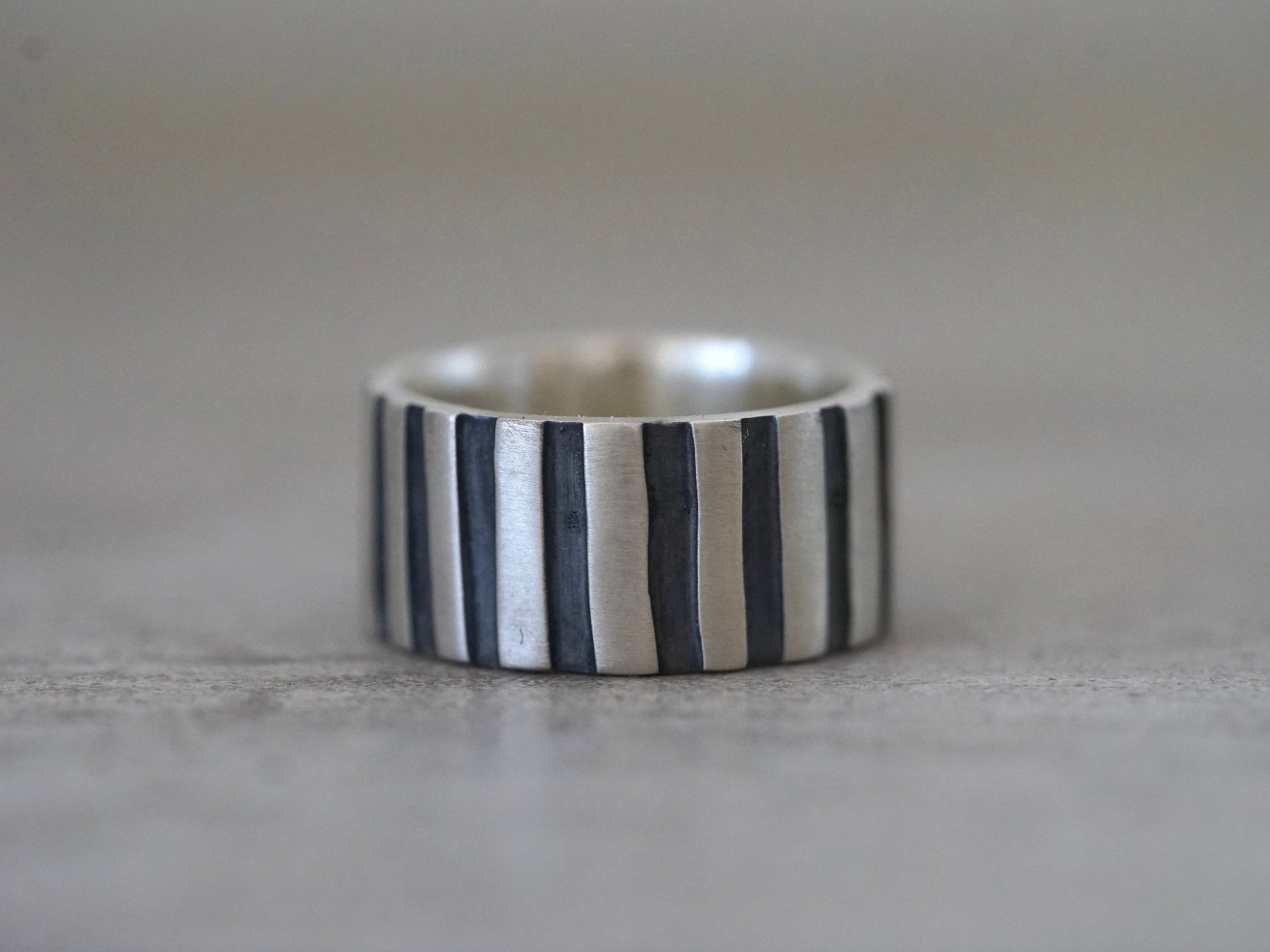 This unique mens ring was created by me in my studio. I originally designed this ring as a birthday gift for my husband. I wanted to achieve a clean yet organic look, with a calm but still interesting pattern, something unusual but nothing too flashy. He is quite happy with the gift and I decided to recreate this ring for my Etsy collection, so here it is. I give you a layered sterling silver band with clear lines, the palisade pattern accentuated by oxidation. All edges were carved and sanded by hand, the inside edge is slightly curved and the ring has a wonderful tactile quality and a good weight. This is a perfect ring for everyday wear, it is a unisex design and would look great as a partner ring or an alternative wedding band.