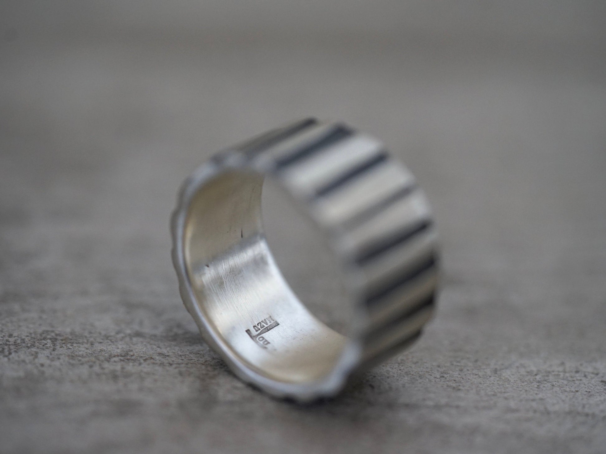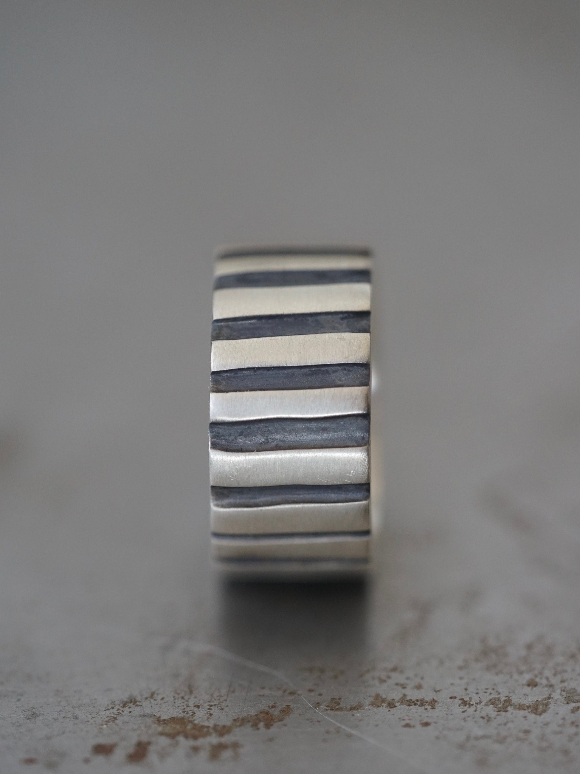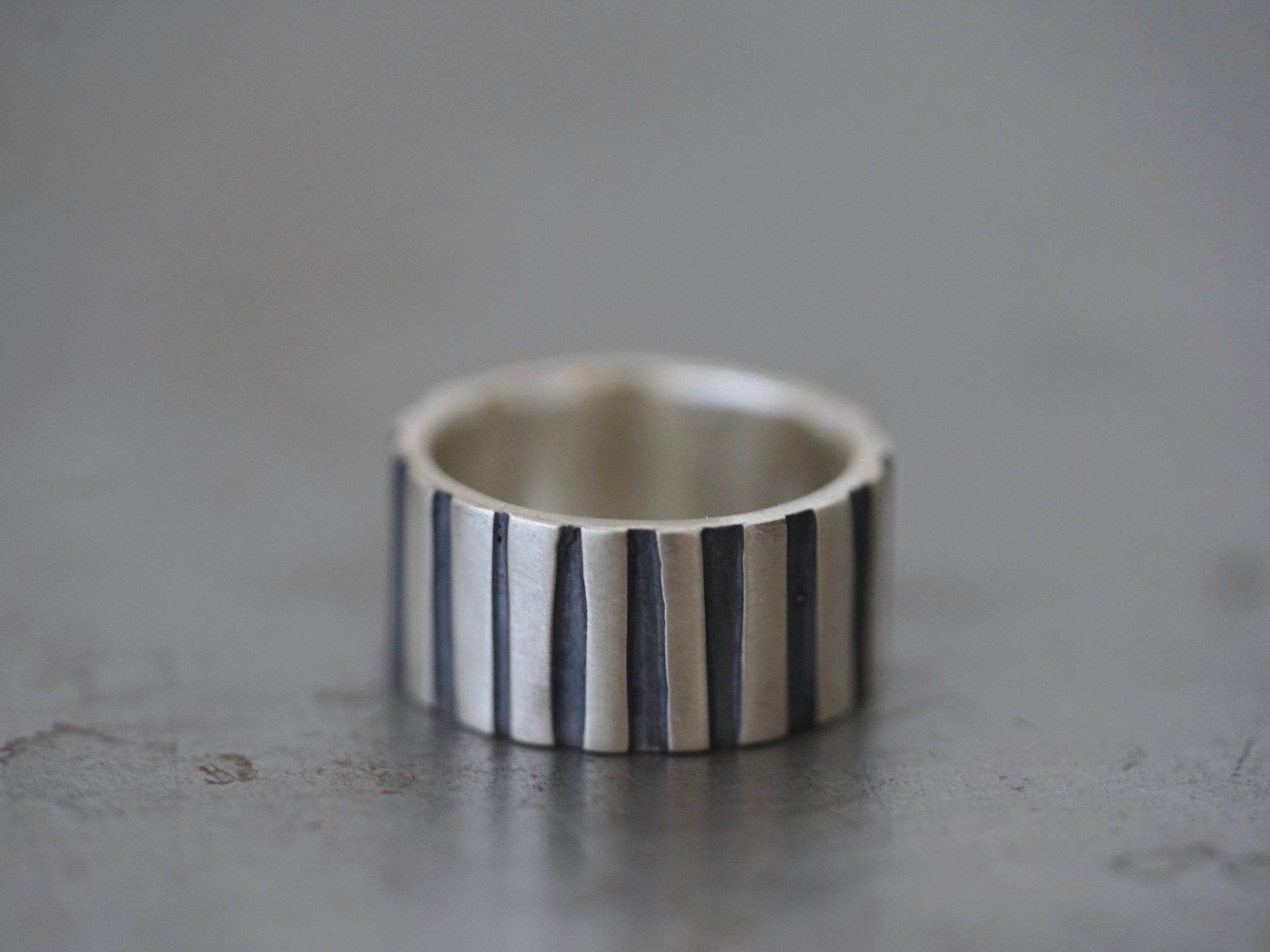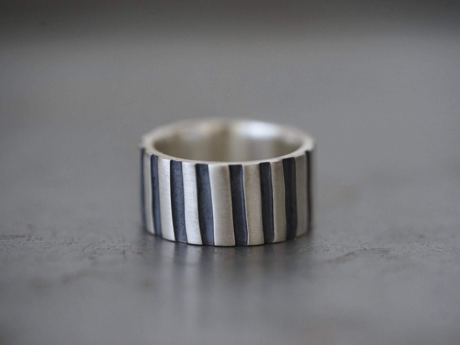 This unique mens ring was created by me in my studio. I originally designed this ring as a birthday gift for my husband. I wanted to achieve a clean yet organic look, with a calm but still interesting pattern, something unusual but nothing too flashy. He is quite happy with the gift and I decided to recreate this ring for my Etsy collection, so here it is. I give you a layered sterling silver band with clear lines, the palisade pattern accentuated by oxidation. All edges were carved and sanded by hand, the inside edge is slightly curved and the ring has a wonderful tactile quality and a good weight. This is a perfect ring for everyday wear, it is a unisex design and would look great as a partner ring or an alternative wedding band.