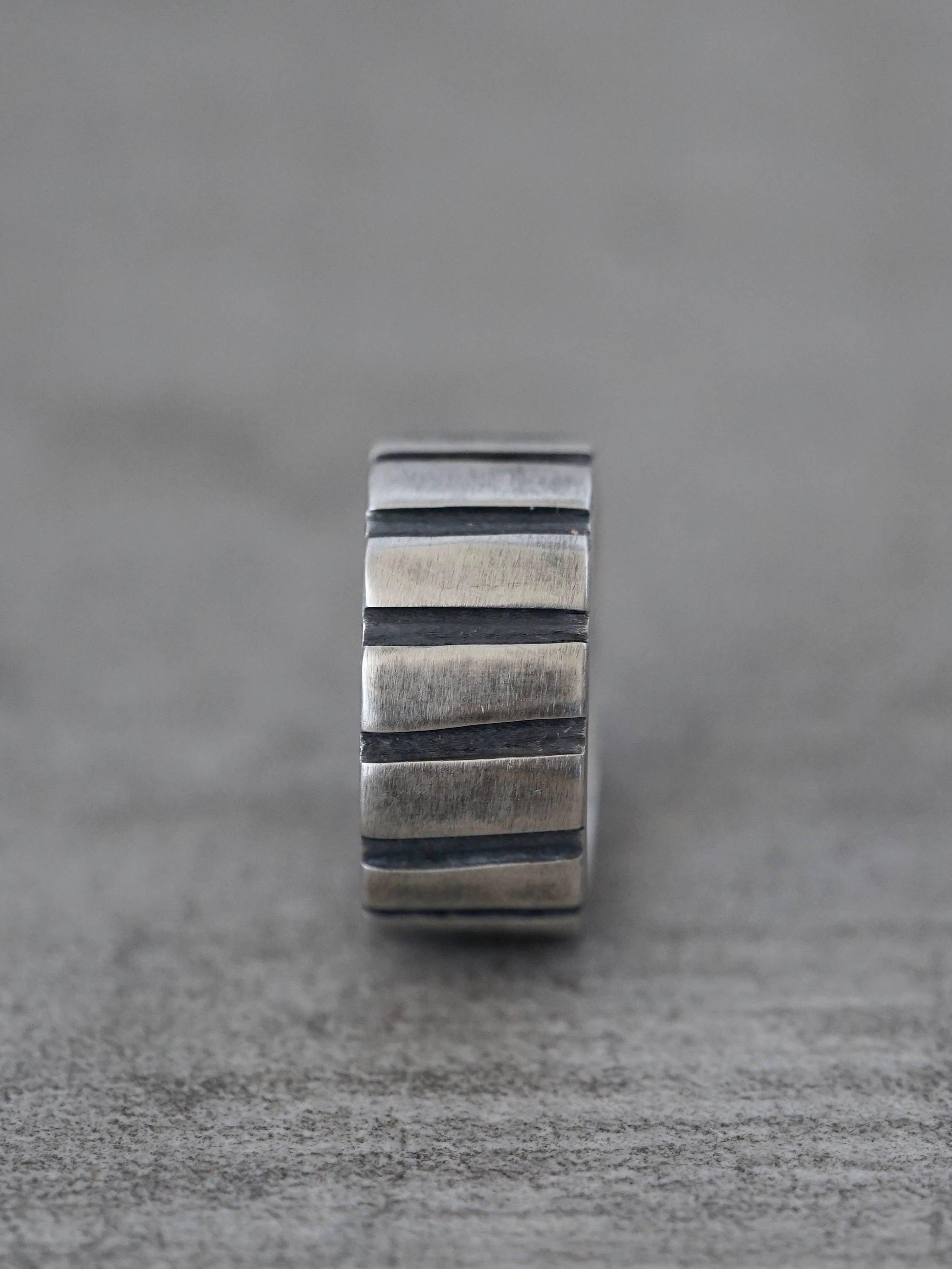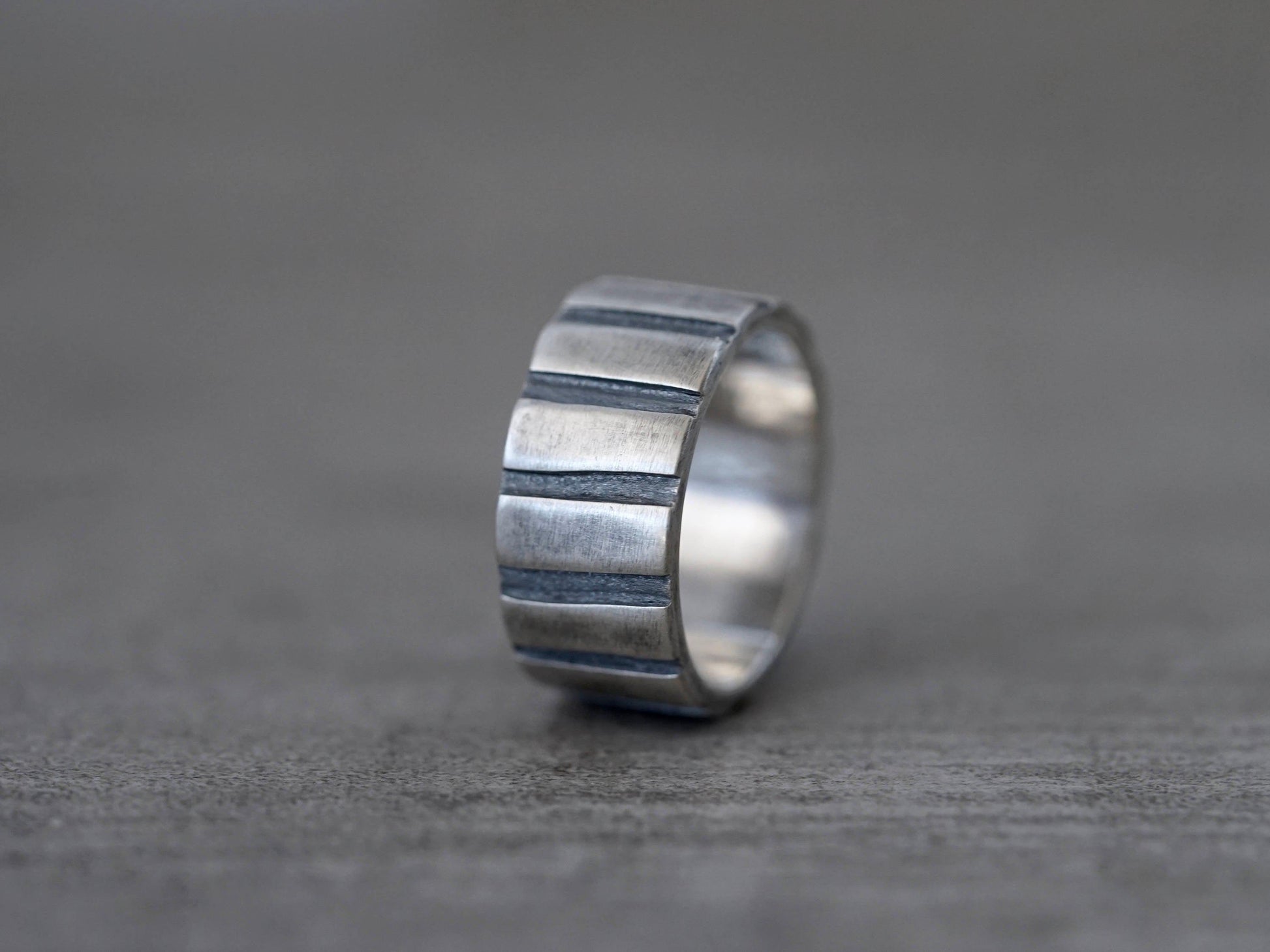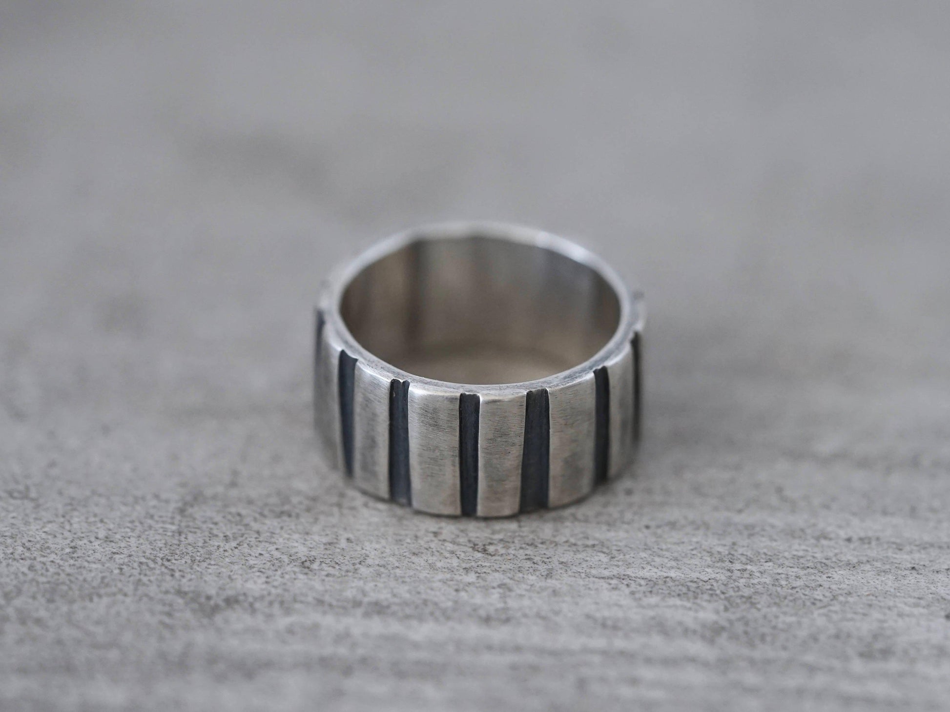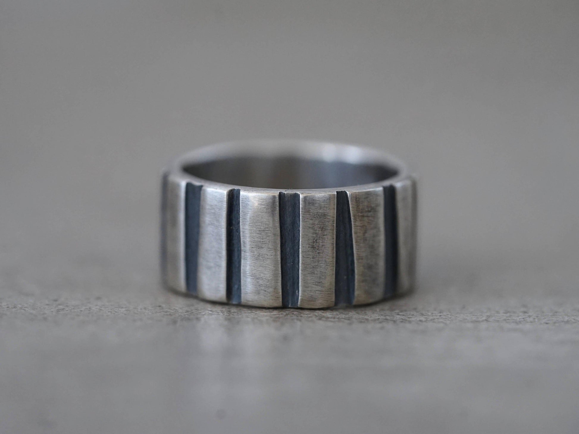 I originally designed this ring as a birthday gift for my husband. I wanted to achieve a clean yet organic look, with a calm but still interesting pattern, something unusual but nothing too flashy. He is quite happy with the gift and I decided to recreate this ring for my Etsy collection, so here it is: a layered sterling silver band with clear lines, the palisade pattern accentuated through oxidation. All edges were carved and sanded by hand, the inside edge is slightly curved and the ring has a wonderful tactile quality. This is a perfect ring for everyday wear, it is a unisex design and would look great as a partner ring or an alternative wedding band.