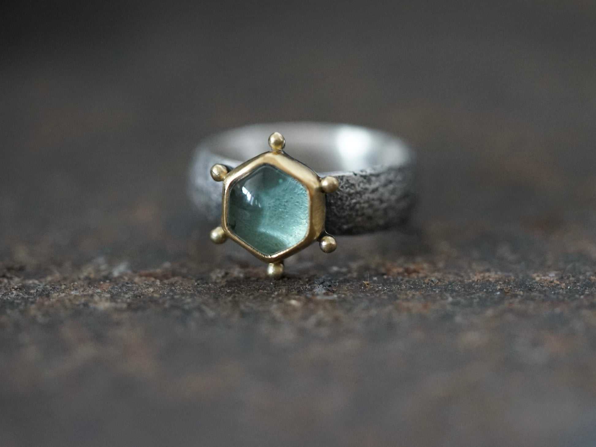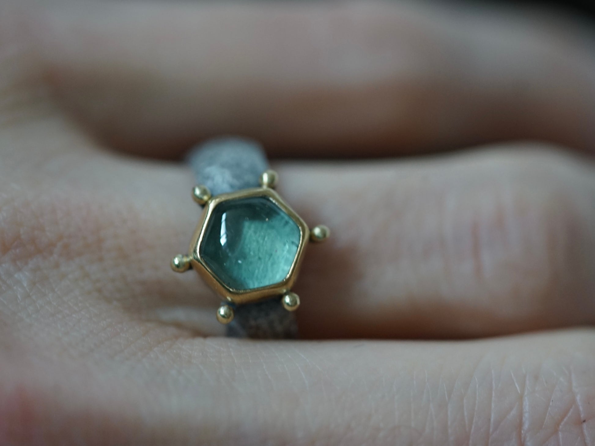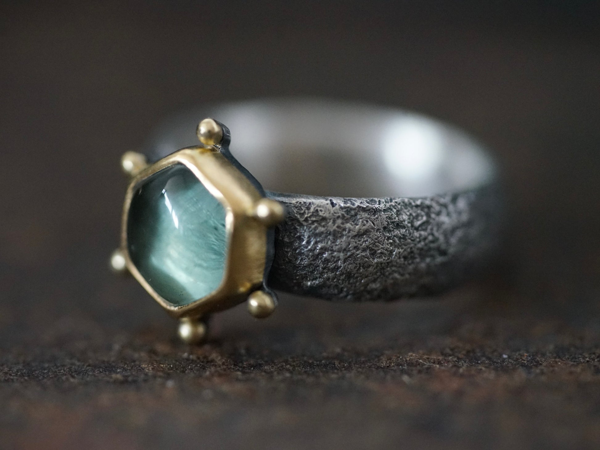 This stone has been in my collection for a long time. It has found its place in this statement ring, set in 22k gold, surrounded by little gold spheres, mounted on a stone textured sterling silver band.