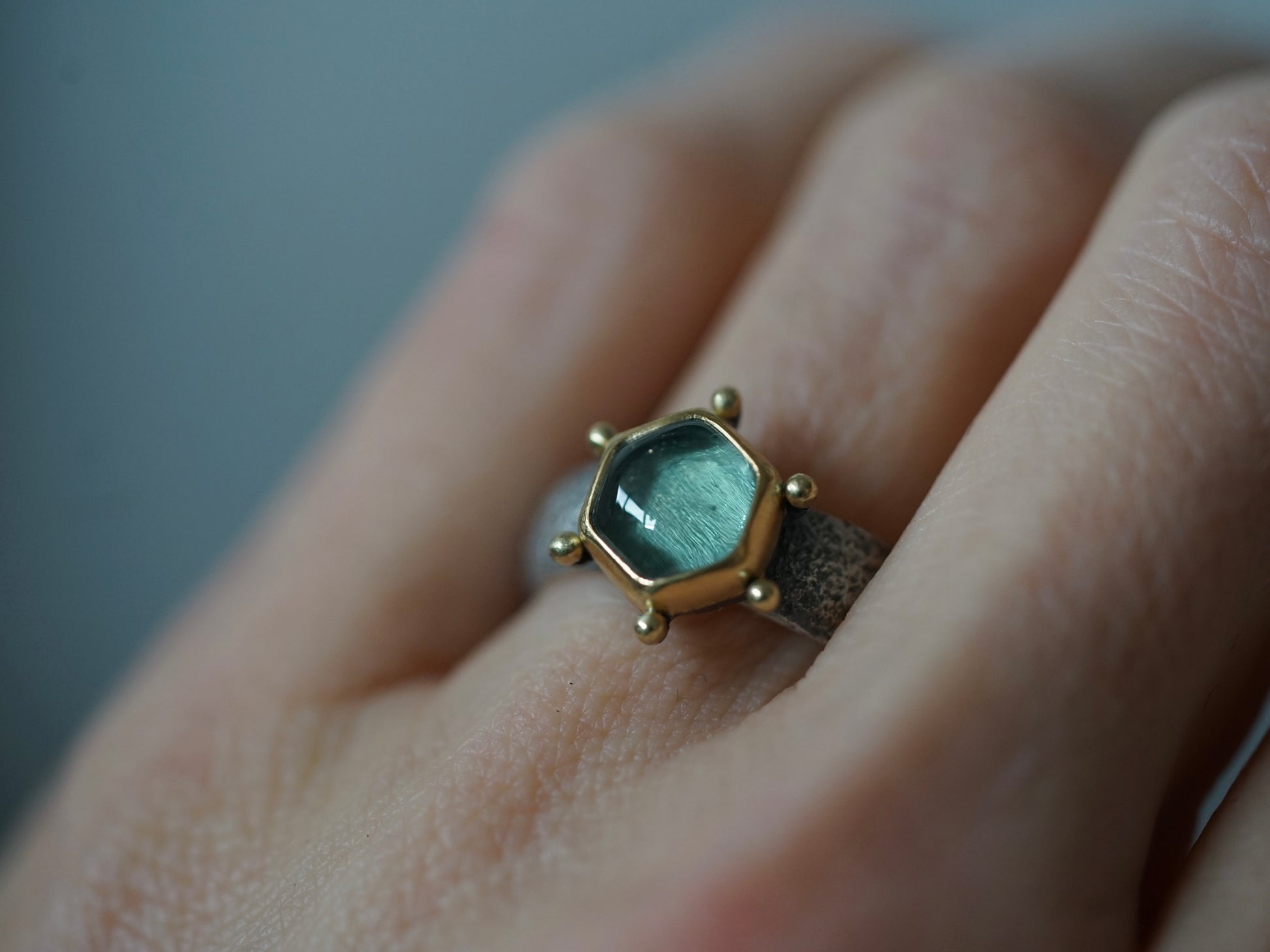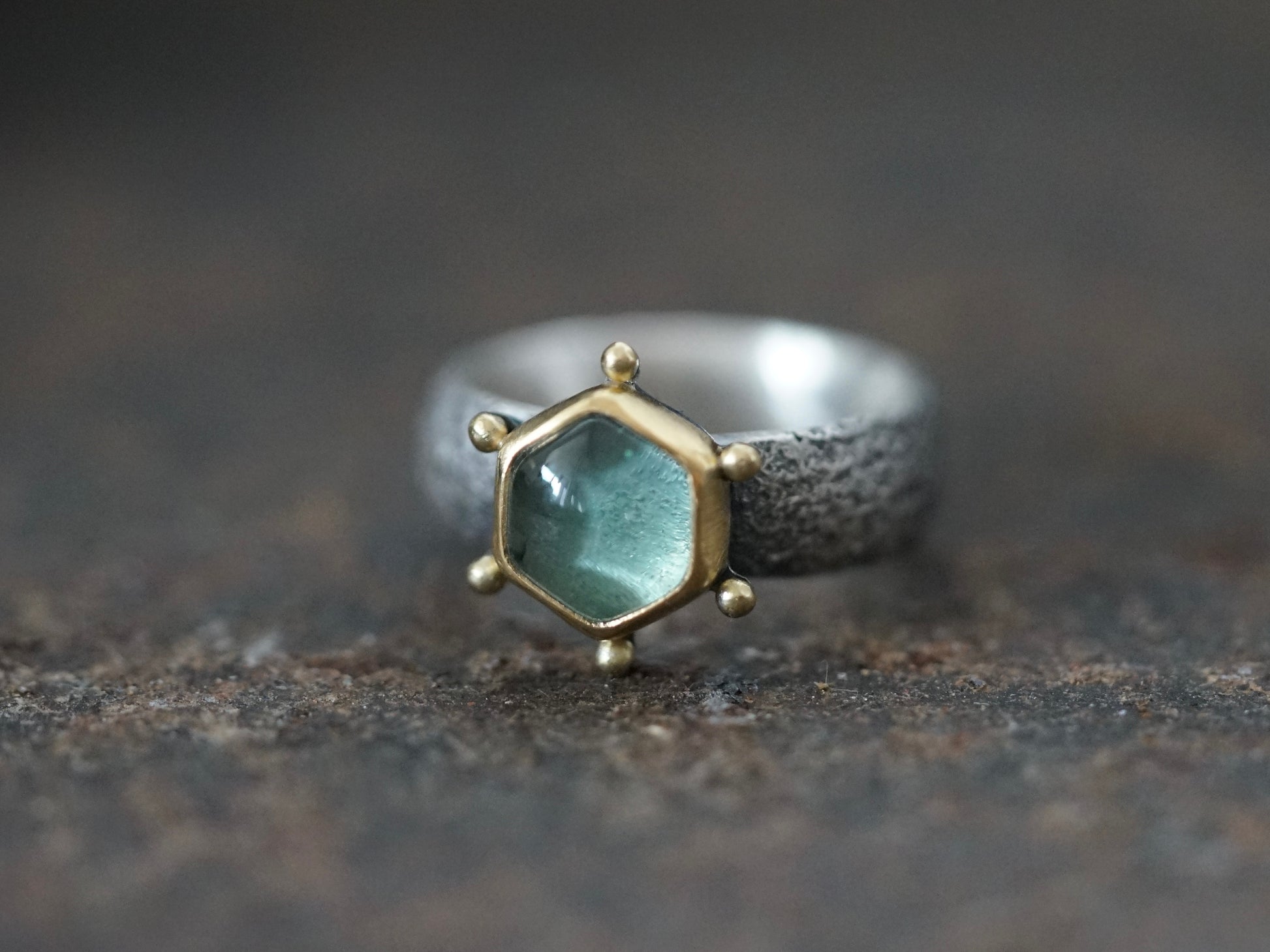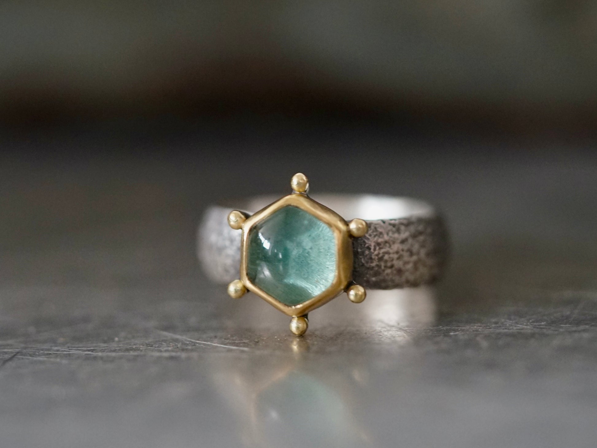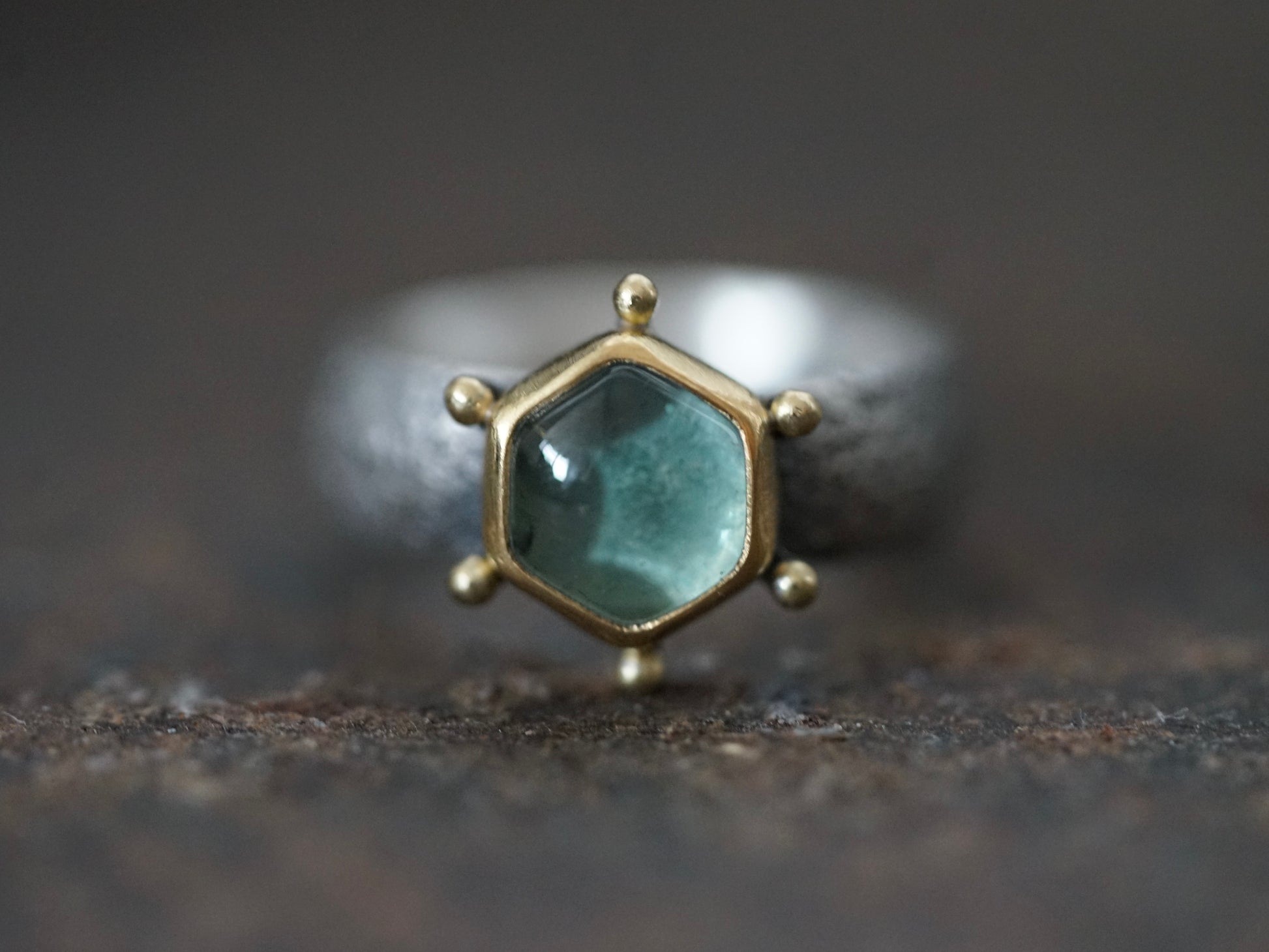 This stone has been in my collection for a long time. It has found its place in this statement ring, set in 22k gold, surrounded by little gold spheres, mounted on a stone textured sterling silver band.